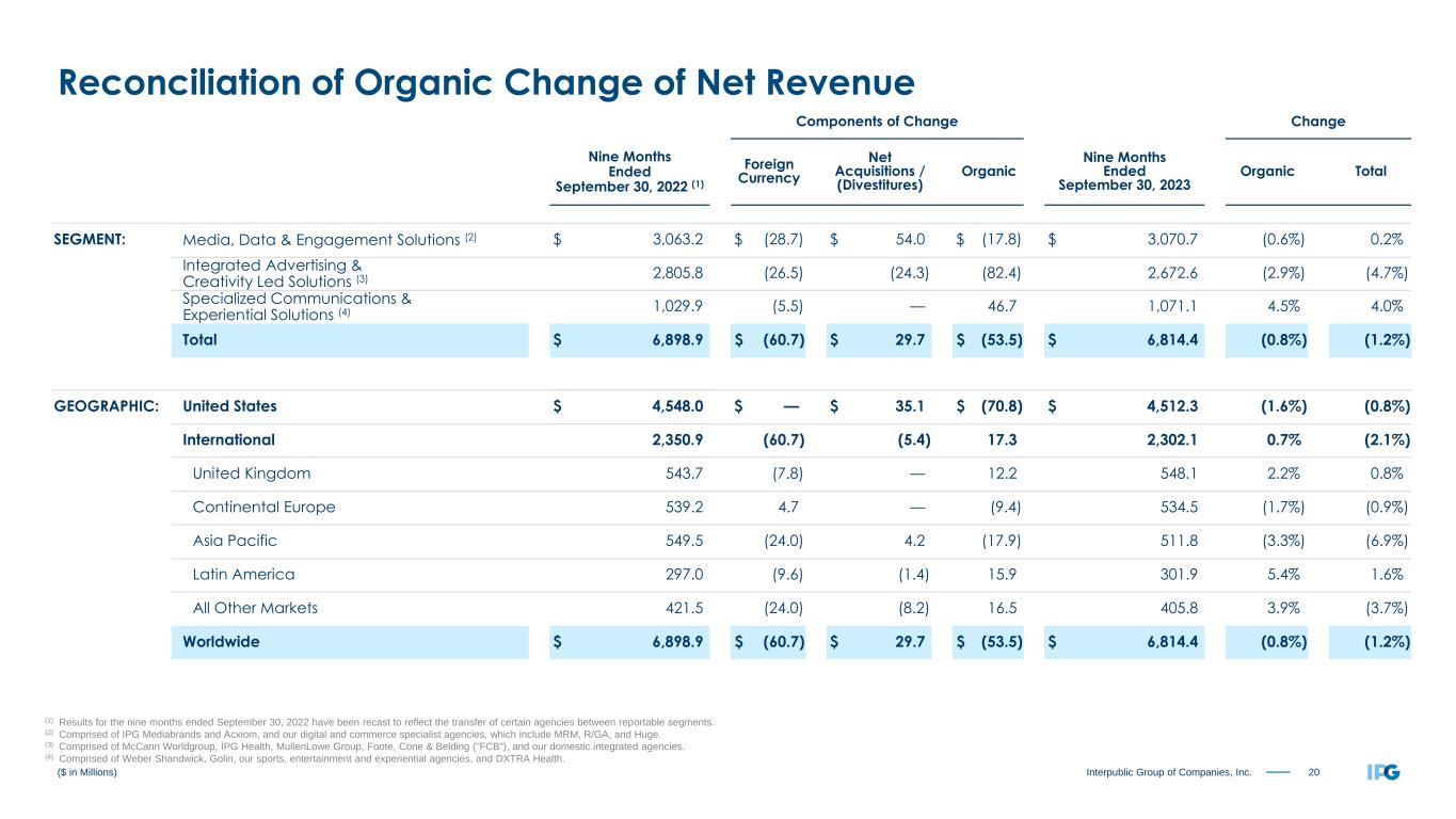 19Interpublic Group of Companies, Inc. Components of Change Change Three Months Ended September 30, 2022 (1) Foreign Currency Net Acquisitions / (Divestitures) Organic Three Months Ended September 30, 2023 Organic Total SEGMENT: Media, Data & Engagement Solutions (2) $ 1,024.2 $ 7.3 $ 17.9 $ 5.0 $ 1,054.4 0.5% 2.9% Integrated Advertising & Creativity Led Solutions (3) 927.1 3.8 (9.9) (37.7) 883.3 (4.1%) (4.7%) Specialized Communications & Experiential Solutions (4) 344.9 3.9 — 22.5 371.3 6.5% 7.7% Total $ 2,296.2 $ 15.0 $ 8.0 $ (10.2) $ 2,309.0 (0.4%) 0.6% GEOGRAPHIC: United States $ 1,523.0 $ — $ 5.6 $ (18.7) $ 1,509.9 (1.2%) (0.9%) International 773.2 15.0 2.4 8.5 799.1 1.1% 3.3% United Kingdom 176.5 12.7 — 3.8 193.0 2.2% 9.3% Continental Europe 160.1 12.0 — 6.2 178.3 3.9% 11.4% Asia Pacific 187.1 (4.6) 2.1 (9.3) 175.3 (5.0%) (6.3%) Latin America 107.4 1.3 — 6.1 114.8 5.7% 6.9% All Other Markets 142.1 (6.4) 0.3 1.7 137.7 1.2% (3.1%) Worldwide $ 2,296.2 $ 15.0 $ 8.0 $ (10.2) $ 2,309.0 (0.4%) 0.6% ($ in Millions) Reconciliation of Organic Change of Net Revenue (1) Results for the three months ended September 30, 2022 have been recast to reflect the transfer of certain agencies between reportable segments. (2) Comprised of IPG Mediabrands and Acxiom, and our digital and commerce specialist agencies, which include MRM, R/GA, and Huge. (3) Comprised of McCann Worldgroup, IPG Health, MullenLowe Group, Foote, Cone & Belding ("FCB"), and our domestic integrated agencies. (4) Comprised of Weber Shandwick, Golin, our sports, entertainment and experiential agencies, and DXTRA Health.
