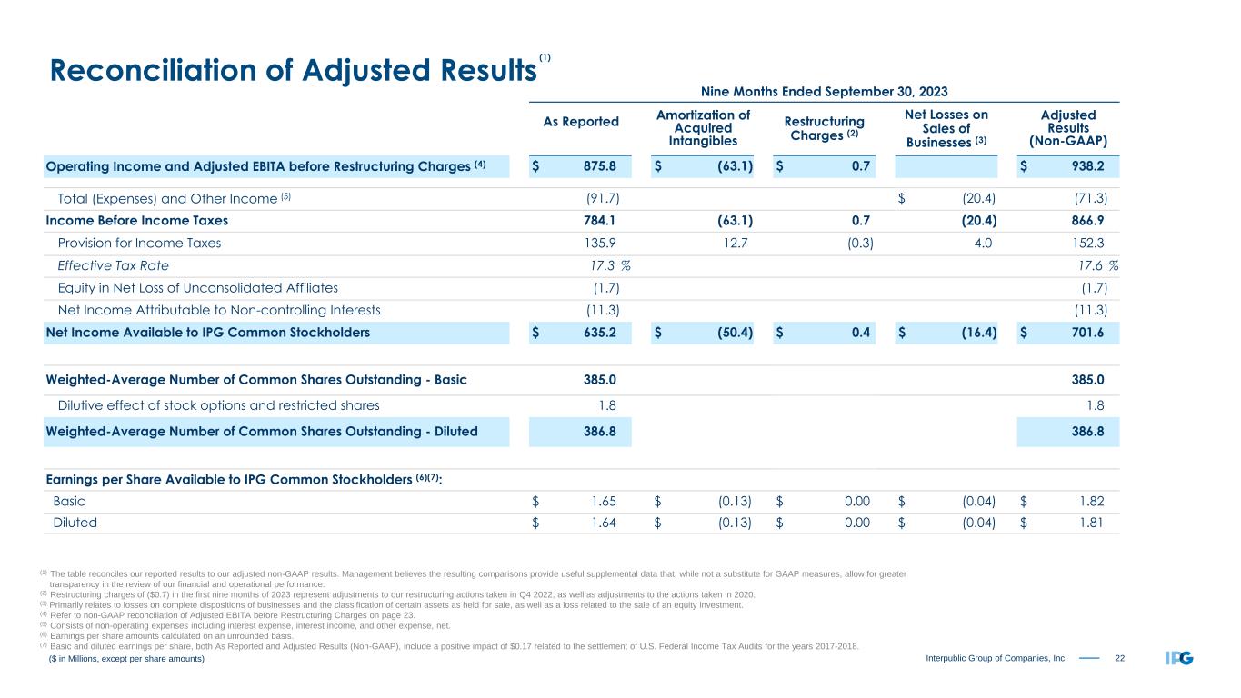 21Interpublic Group of Companies, Inc. Three Months Ended September 30, 2023 As Reported Amortization of Acquired Intangibles Restructuring Charges (2) Net Losses on Sales of Businesses (3) Adjusted Results (Non-GAAP) Operating Income and Adjusted EBITA before Restructuring Charges (4) $ 376.8 $ (21.0) $ 0.6 $ 397.2 Total (Expenses) and Other Income (5) (37.3) $ (12.1) (25.2) Income Before Income Taxes 339.5 (21.0) 0.6 (12.1) 372.0 Provision for Income Taxes 91.5 4.3 (0.2) 2.6 98.2 Effective Tax Rate 27.0 % 26.4 % Equity in Net Loss of Unconsolidated Affiliates (2.3) (2.3) Net Income Attributable to Non-controlling Interests (2.0) (2.0) Net Income Available to IPG Common Stockholders $ 243.7 $ (16.7) $ 0.4 $ (9.5) $ 269.5 Weighted-Average Number of Common Shares Outstanding - Basic 383.6 383.6 Dilutive effect of stock options and restricted shares 1.9 1.9 Weighted-Average Number of Common Shares Outstanding - Diluted 385.5 385.5 Earnings per Share Available to IPG Common Stockholders (6): Basic $ 0.64 $ (0.04) $ 0.00 $ (0.02) $ 0.70 Diluted $ 0.63 $ (0.04) $ 0.00 $ (0.02) $ 0.70 ($ in Millions, except per share amounts) (1) The table reconciles our reported results to our adjusted non-GAAP results. Management believes the resulting comparisons provide useful supplemental data that, while not a substitute for GAAP measures, allow for greater transparency in the review of our financial and operational performance. (2) Restructuring charges of ($0.6) in the third quarter of 2023 represent adjustments to our restructuring actions taken in Q4 2022, as well as adjustments to the actions taken in 2020. (3) Primarily relates to losses on complete dispositions of businesses and the classification of certain assets as held for sale. (4) Refer to non-GAAP reconciliation of Adjusted EBITA before Restructuring Charges on page 23. (5) Consists of non-operating expenses including interest expense, interest income, and other expense, net. (6) Earnings per share amounts calculated on an unrounded basis. Reconciliation of Adjusted Results (1)