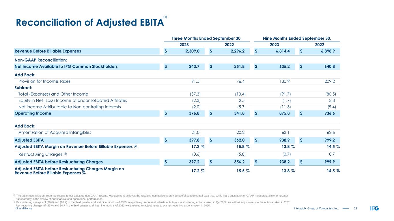 22Interpublic Group of Companies, Inc. ($ in Millions, except per share amounts) Reconciliation of Adjusted Results (1) Nine Months Ended September 30, 2023 As Reported Amortization of Acquired Intangibles Restructuring Charges (2) Net Losses on Sales of Businesses (3) Adjusted Results (Non-GAAP) Operating Income and Adjusted EBITA before Restructuring Charges (4) $ 875.8 $ (63.1) $ 0.7 $ 938.2 Total (Expenses) and Other Income (5) (91.7) $ (20.4) (71.3) Income Before Income Taxes 784.1 (63.1) 0.7 (20.4) 866.9 Provision for Income Taxes 135.9 12.7 (0.3) 4.0 152.3 Effective Tax Rate 17.3 % 17.6 % Equity in Net Loss of Unconsolidated Affiliates (1.7) (1.7) Net Income Attributable to Non-controlling Interests (11.3) (11.3) Net Income Available to IPG Common Stockholders $ 635.2 $ (50.4) $ 0.4 $ (16.4) $ 701.6 Weighted-Average Number of Common Shares Outstanding - Basic 385.0 385.0 Dilutive effect of stock options and restricted shares 1.8 1.8 Weighted-Average Number of Common Shares Outstanding - Diluted 386.8 386.8 Earnings per Share Available to IPG Common Stockholders (6)(7): Basic $ 1.65 $ (0.13) $ 0.00 $ (0.04) $ 1.82 Diluted $ 1.64 $ (0.13) $ 0.00 $ (0.04) $ 1.81 (1) The table reconciles our reported results to our adjusted non-GAAP results. Management believes the resulting comparisons provide useful supplemental data that, while not a substitute for GAAP measures, allow for greater transparency in the review of our financial and operational performance. (2) Restructuring charges of ($0.7) in the first nine months of 2023 represent adjustments to our restructuring actions taken in Q4 2022, as well as adjustments to the actions taken in 2020. (3) Primarily relates to losses on complete dispositions of businesses and the classification of certain assets as held for sale, as well as a loss related to the sale of an equity investment. (4) Refer to non-GAAP reconciliation of Adjusted EBITA before Restructuring Charges on page 23. (5) Consists of non-operating expenses including interest expense, interest income, and other expense, net. (6) Earnings per share amounts calculated on an unrounded basis. (7) Basic and diluted earnings per share, both As Reported and Adjusted Results (Non-GAAP), include a positive impact of $0.17 related to the settlement of U.S. Federal Income Tax Audits for the years 2017-2018.
