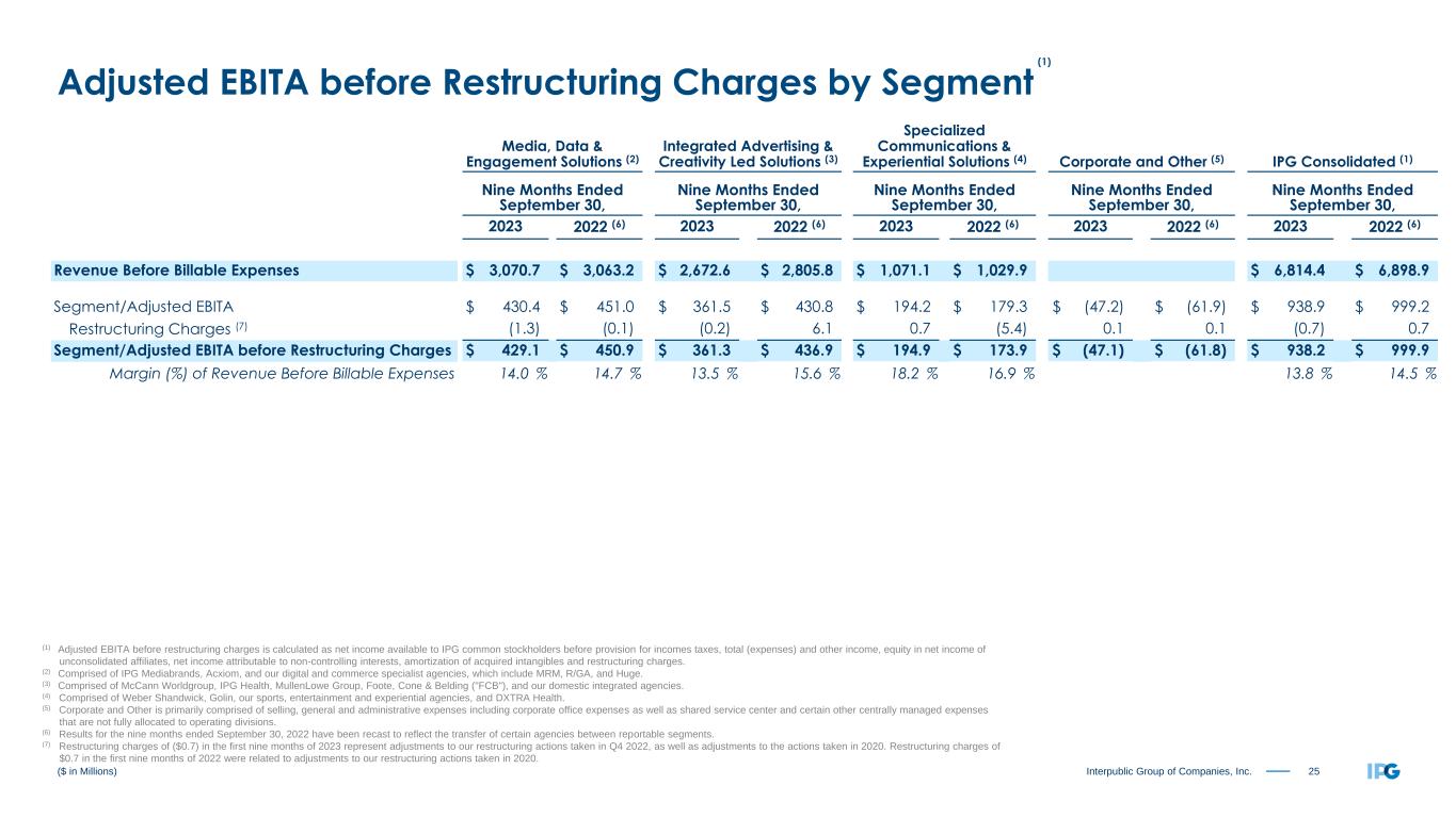 24Interpublic Group of Companies, Inc. Media, Data & Engagement Solutions (2) Integrated Advertising & Creativity Led Solutions (3) Specialized Communications & Experiential Solutions (4) Corporate and Other (5) IPG Consolidated (1) Three Months Ended September 30, Three Months Ended September 30, Three Months Ended September 30, Three Months Ended September 30, Three Months Ended September 30, 2023 2022 (6) 2023 2022 (6) 2023 2022 (6) 2023 2022 (6) 2023 2022 (6) Revenue Before Billable Expenses $ 1,054.4 $ 1,024.2 $ 883.3 $ 927.1 $ 371.3 $ 344.9 $ 2,309.0 $ 2,296.2 Segment/Adjusted EBITA $ 208.0 $ 170.3 $ 130.4 $ 147.9 $ 77.7 $ 63.8 $ (18.3) $ (20.0) $ 397.8 $ 362.0 Restructuring Charges (7) (0.1) — (0.5) — (0.2) (5.8) 0.2 — (0.6) (5.8) Segment/Adjusted EBITA before Restructuring Charges $ 207.9 $ 170.3 $ 129.9 $ 147.9 $ 77.5 $ 58.0 $ (18.1) $ (20.0) $ 397.2 $ 356.2 Margin (%) of Revenue Before Billable Expenses 19.7 % 16.6 % 14.7 % 16.0 % 20.9 % 16.8 % 17.2 % 15.5 % ($ in Millions) (1) Adjusted EBITA before restructuring charges is calculated as net income available to IPG common stockholders before provision for incomes taxes, total (expenses) and other income, equity in net income of unconsolidated affiliates, net income attributable to non-controlling interests, amortization of acquired intangibles and restructuring charges. (2) Comprised of IPG Mediabrands, Acxiom, and our digital and commerce specialist agencies, which include MRM, R/GA, and Huge. (3) Comprised of McCann Worldgroup, IPG Health, MullenLowe Group, Foote, Cone & Belding ("FCB"), and our domestic integrated agencies. (4) Comprised of Weber Shandwick, Golin, our sports, entertainment and experiential agencies, and DXTRA Health. (5) Corporate and Other is primarily comprised of selling, general and administrative expenses including corporate office expenses as well as shared service center and certain other centrally managed expenses that are not fully allocated to operating divisions. (6) Results for the three months ended September 30, 2022 have been recast to reflect the transfer of certain agencies between reportable segments. (7) Restructuring charges of ($0.6) in the third quarter of 2023 represent adjustments to our restructuring actions taken in Q4 2022, as well as adjustments to the actions taken in 2020. Restructuring charges of ($5.8) in the third quarter of 2022 were related to adjustments to our restructuring actions taken in 2020. Adjusted EBITA before Restructuring Charges by Segment (1)