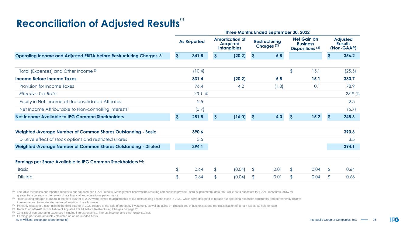 27Interpublic Group of Companies, Inc. ($ in Millions, except per share amounts) Reconciliation of Adjusted Results (1) Nine Months Ended September 30, 2022 As Reported Amortization of Acquired Intangibles Restructuring Charges (2) Net Losses on Business Dispositions (3) Adjusted Results (Non-GAAP) Operating Income and Adjusted EBITA before Restructuring Charges (4) $ 936.6 $ (62.6) $ (0.7) $ 999.9 Total (Expenses) and Other Income (5) (80.5) $ 4.5 (85.0) Income Before Income Taxes 856.1 (62.6) (0.7) 4.5 914.9 Provision for Income Taxes 209.2 12.7 (0.2) 0.1 221.8 Effective Tax Rate 24.4 % 24.2 % Equity in Net Income of Unconsolidated Affiliates 3.3 3.3 Net Income Attributable to Non-controlling Interests (9.4) (9.4) Net Income Available to IPG Common Stockholders $ 640.8 $ (49.9) $ (0.9) $ 4.6 $ 687.0 Weighted-Average Number of Common Shares Outstanding - Basic 392.7 392.7 Dilutive effect of stock options and restricted shares 3.5 3.5 Weighted-Average Number of Common Shares Outstanding - Diluted 396.2 396.2 Earnings per Share Available to IPG Common Stockholders (6): Basic $ 1.63 $ (0.13) $ 0.00 $ 0.01 $ 1.75 Diluted $ 1.62 $ (0.13) $ 0.00 $ 0.01 $ 1.73 (1) The table reconciles our reported results to our adjusted non-GAAP results. Management believes the resulting comparisons provide useful supplemental data that, while not a substitute for GAAP measures, allow for greater transparency in the review of our financial and operational performance. (2) Restructuring charges of $0.7 in the first nine months of 2022 were related to adjustments to our restructuring actions taken in 2020, which were designed to reduce our operating expenses structurally and permanently relative to revenue and to accelerate the transformation of our business. (3) Primarily includes a cash gain in the first nine months of 2022 related to the sale of an equity investment, partially offset by a non-cash loss related to the deconsolidation of a previously consolidated subsidiary in which we maintain an equity investment, as well as losses on dispositions of businesses and the classification of certain assets as held for sale. (4) Refer to non-GAAP reconciliation of Adjusted EBITA before Restructuring Charges on page 23. (5) Consists of non-operating expenses including interest expense, interest income, and other expense, net. (6) Earnings per share amounts calculated on an unrounded basis.