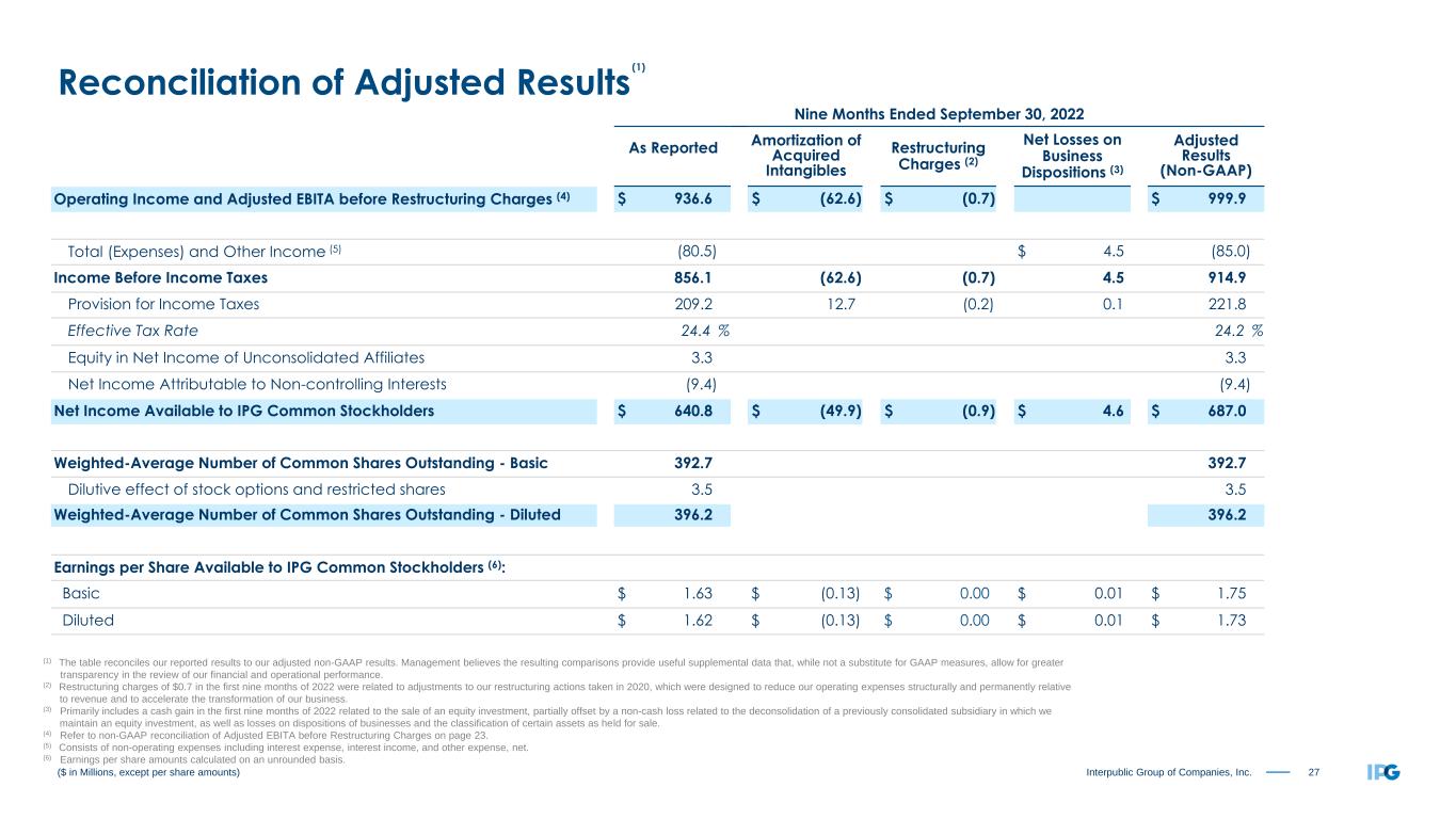 26Interpublic Group of Companies, Inc. Three Months Ended September 30, 2022 As Reported Amortization of Acquired Intangibles Restructuring Charges (2) Net Gain on Business Dispositions (3) Adjusted Results (Non-GAAP) Operating Income and Adjusted EBITA before Restructuring Charges (4) $ 341.8 $ (20.2) $ 5.8 $ 356.2 Total (Expenses) and Other Income (5) (10.4) $ 15.1 (25.5) Income Before Income Taxes 331.4 (20.2) 5.8 15.1 330.7 Provision for Income Taxes 76.4 4.2 (1.8) 0.1 78.9 Effective Tax Rate 23.1 % 23.9 % Equity in Net Income of Unconsolidated Affiliates 2.5 2.5 Net Income Attributable to Non-controlling Interests (5.7) (5.7) Net Income Available to IPG Common Stockholders $ 251.8 $ (16.0) $ 4.0 $ 15.2 $ 248.6 Weighted-Average Number of Common Shares Outstanding - Basic 390.6 390.6 Dilutive effect of stock options and restricted shares 3.5 3.5 Weighted-Average Number of Common Shares Outstanding - Diluted 394.1 394.1 Earnings per Share Available to IPG Common Stockholders (6): Basic $ 0.64 $ (0.04) $ 0.01 $ 0.04 $ 0.64 Diluted $ 0.64 $ (0.04) $ 0.01 $ 0.04 $ 0.63 ($ in Millions, except per share amounts) (1) The table reconciles our reported results to our adjusted non-GAAP results. Management believes the resulting comparisons provide useful supplemental data that, while not a substitute for GAAP measures, allow for greater transparency in the review of our financial and operational performance. (2) Restructuring charges of ($5.8) in the third quarter of 2022 were related to adjustments to our restructuring actions taken in 2020, which were designed to reduce our operating expenses structurally and permanently relative to revenue and to accelerate the transformation of our business. (3) Primarily relates to a cash gain in the third quarter of 2022 related to the sale of an equity investment, as well as gains on dispositions of businesses and the classification of certain assets as held for sale. (4) Refer to non-GAAP reconciliation of Adjusted EBITA before Restructuring Charges on page 23. (5) Consists of non-operating expenses including interest expense, interest income, and other expense, net. (6) Earnings per share amounts calculated on an unrounded basis. Reconciliation of Adjusted Results (1)