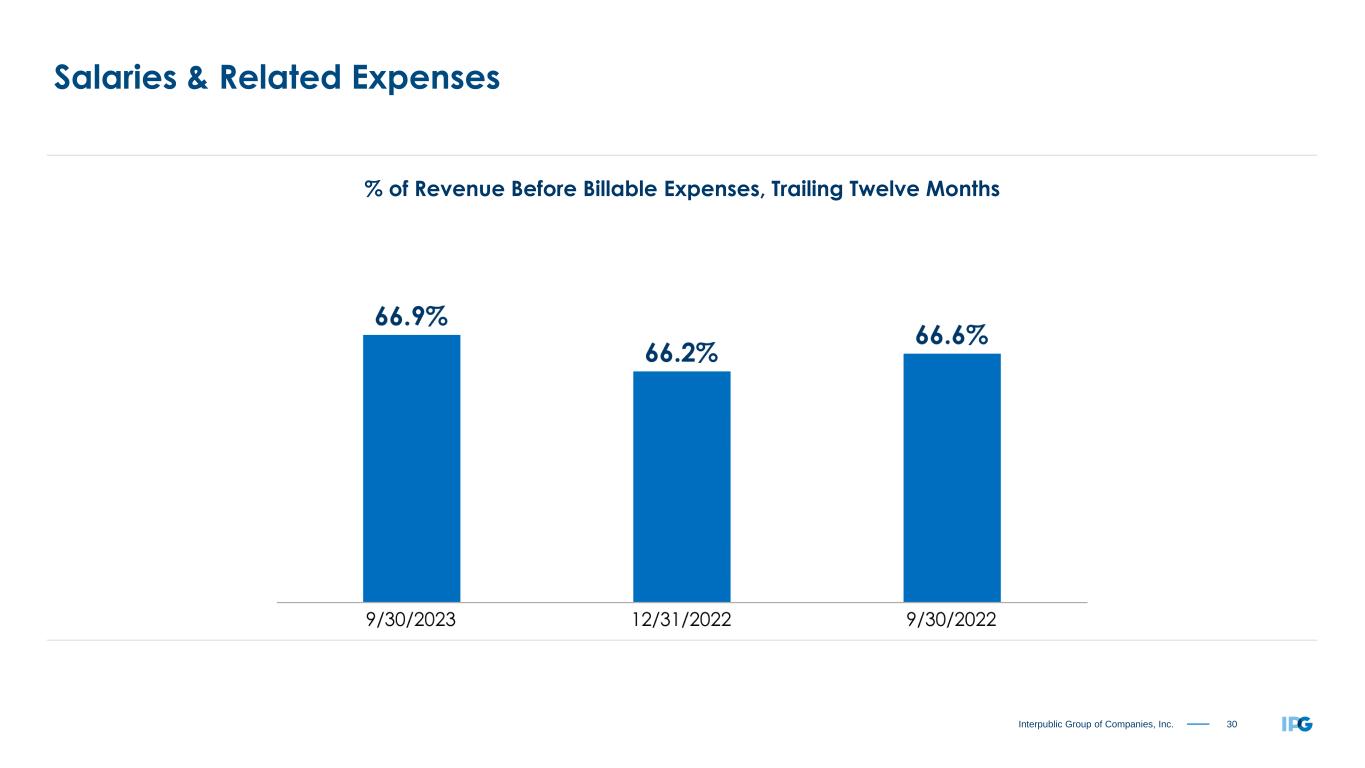 29Interpublic Group of Companies, Inc. Metrics Update CATEGORY: SALARIES & RELATED OFFICE & OTHER DIRECT FINANCIAL (% of Revenue Before Billable Expenses) (% of Revenue Before Billable Expenses) METRIC: Trailing Twelve Months Trailing Twelve Months Available Liquidity Base, Benefits & Tax Occupancy Expense Credit Facility Covenant Incentive Expense All Other Office & Other Direct Expenses Severance Expense Temporary Help