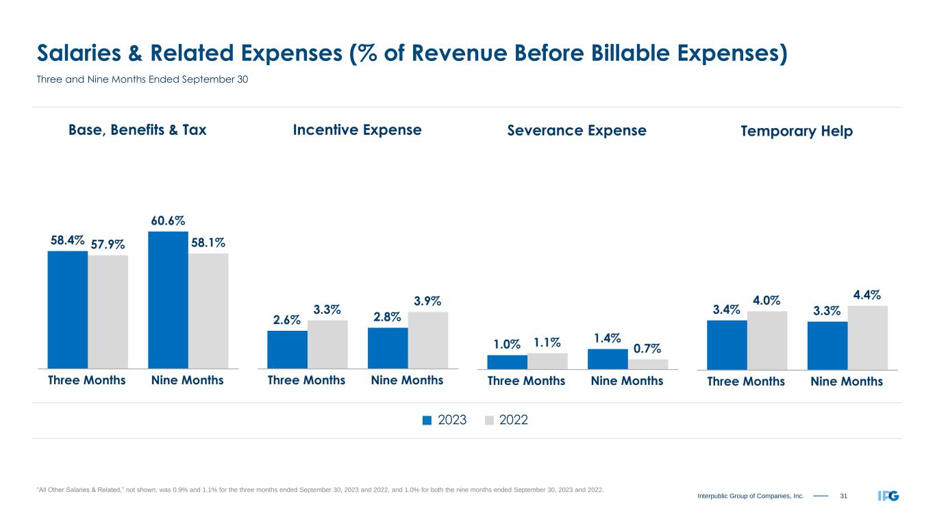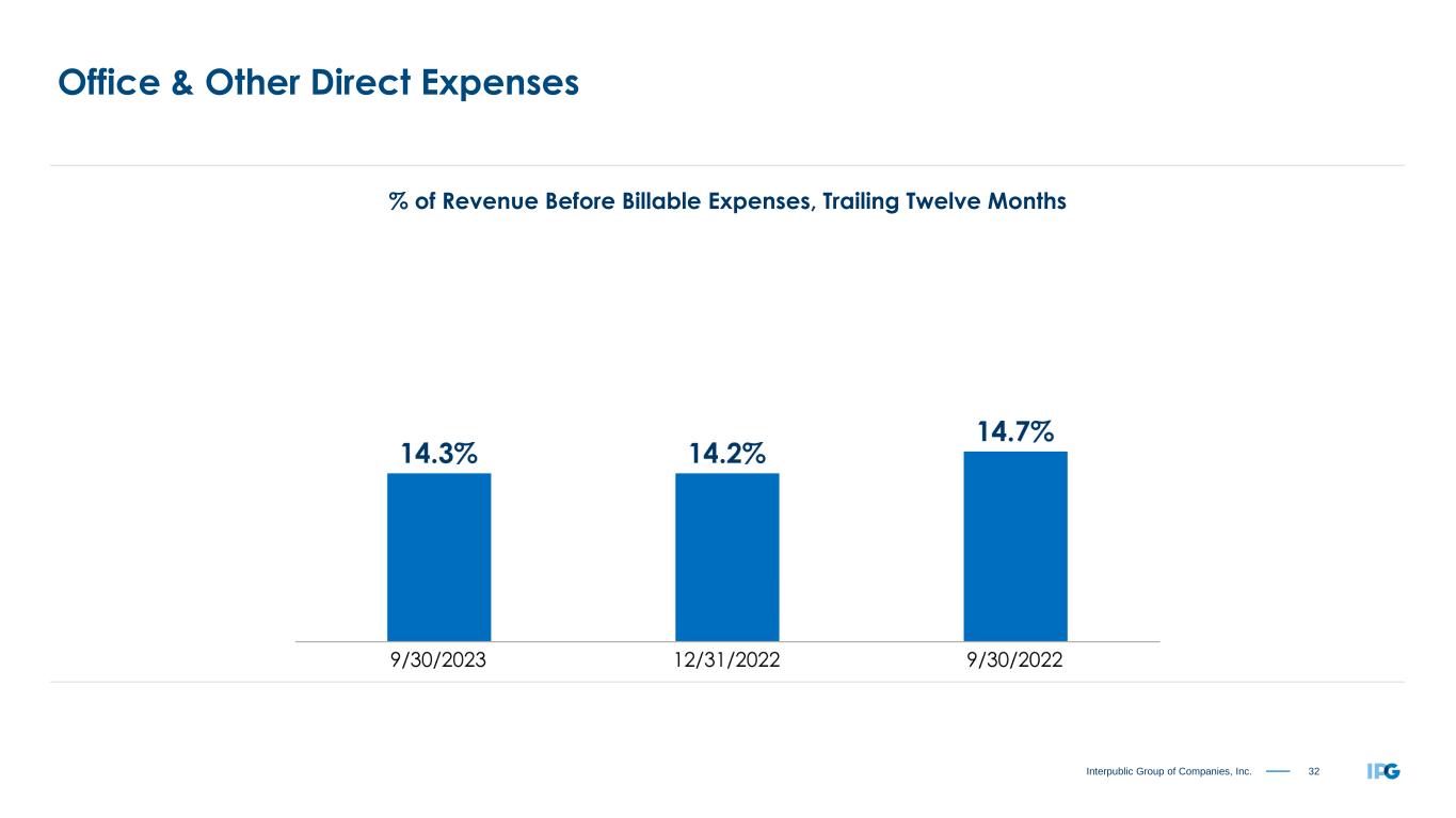 31Interpublic Group of Companies, Inc. Salaries & Related Expenses (% of Revenue Before Billable Expenses) “All Other Salaries & Related,” not shown, was 0.9% and 1.1% for the three months ended September 30, 2023 and 2022, and 1.0% for both the nine months ended September 30, 2023 and 2022. Three and Nine Months Ended September 30 2023 2022