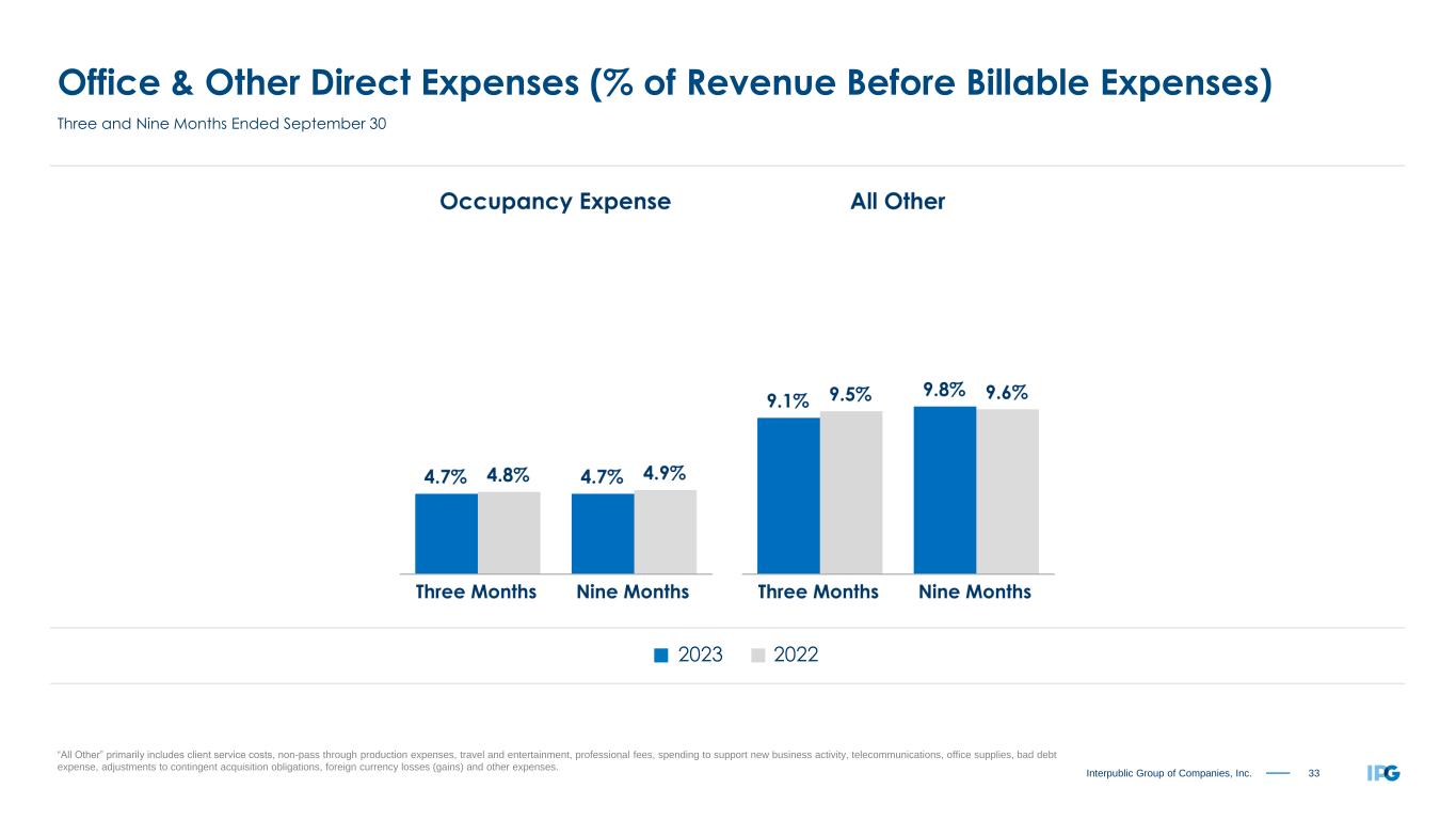 33Interpublic Group of Companies, Inc. Office & Other Direct Expenses (% of Revenue Before Billable Expenses) “All Other” primarily includes client service costs, non-pass through production expenses, travel and entertainment, professional fees, spending to support new business activity, telecommunications, office supplies, bad debt expense, adjustments to contingent acquisition obligations, foreign currency losses (gains) and other expenses. 2023 2022 Three and Nine Months Ended September 30