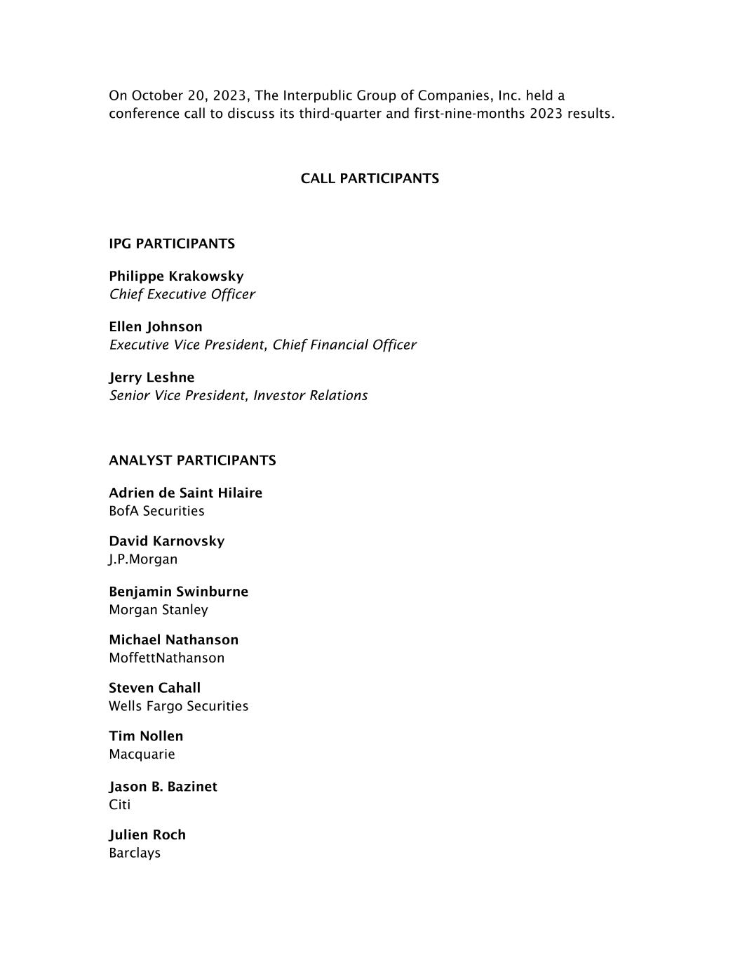 On October 20, 2023, The Interpublic Group of Companies, Inc. held a conference call to discuss its third-quarter and first-nine-months 2023 results. CALL PARTICIPANTS IPG PARTICIPANTS Philippe Krakowsky Chief Executive Officer Ellen Johnson Executive Vice President, Chief Financial Officer Jerry Leshne Senior Vice President, Investor Relations ANALYST PARTICIPANTS Adrien de Saint Hilaire BofA Securities David Karnovsky J.P.Morgan Benjamin Swinburne Morgan Stanley Michael Nathanson MoffettNathanson Steven Cahall Wells Fargo Securities Tim Nollen Macquarie Jason B. Bazinet Citi Julien Roch Barclays