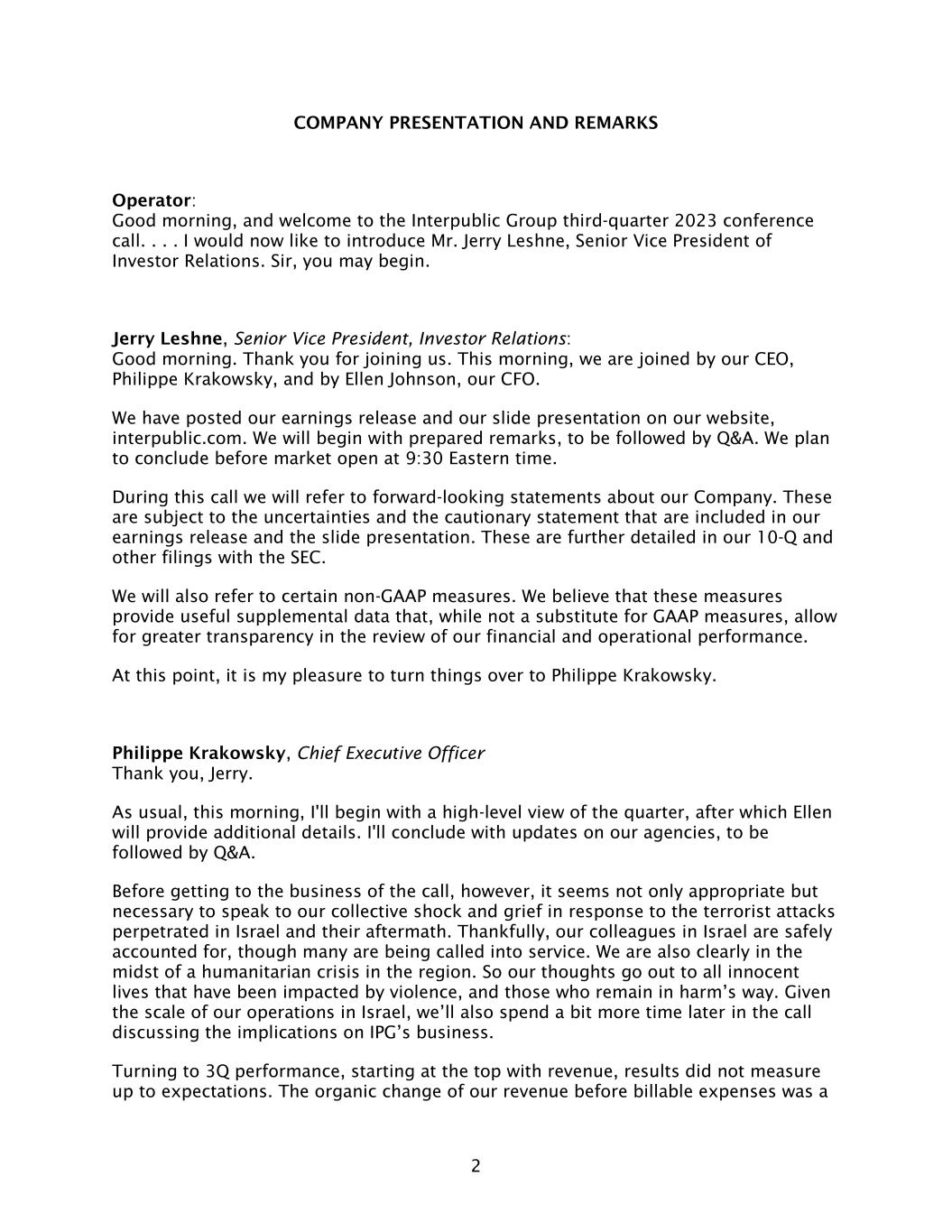 2 COMPANY PRESENTATION AND REMARKS Operator: Good morning, and welcome to the Interpublic Group third-quarter 2023 conference call. . . . I would now like to introduce Mr. Jerry Leshne, Senior Vice President of Investor Relations. Sir, you may begin. Jerry Leshne, Senior Vice President, Investor Relations: Good morning. Thank you for joining us. This morning, we are joined by our CEO, Philippe Krakowsky, and by Ellen Johnson, our CFO. We have posted our earnings release and our slide presentation on our website, interpublic.com. We will begin with prepared remarks, to be followed by Q&A. We plan to conclude before market open at 9:30 Eastern time. During this call we will refer to forward-looking statements about our Company. These are subject to the uncertainties and the cautionary statement that are included in our earnings release and the slide presentation. These are further detailed in our 10-Q and other filings with the SEC. We will also refer to certain non-GAAP measures. We believe that these measures provide useful supplemental data that, while not a substitute for GAAP measures, allow for greater transparency in the review of our financial and operational performance. At this point, it is my pleasure to turn things over to Philippe Krakowsky. Philippe Krakowsky, Chief Executive Officer Thank you, Jerry. As usual, this morning, I'll begin with a high-level view of the quarter, after which Ellen will provide additional details. I'll conclude with updates on our agencies, to be followed by Q&A. Before getting to the business of the call, however, it seems not only appropriate but necessary to speak to our collective shock and grief in response to the terrorist attacks perpetrated in Israel and their aftermath. Thankfully, our colleagues in Israel are safely accounted for, though many are being called into service. We are also clearly in the midst of a humanitarian crisis in the region. So our thoughts go out to all innocent lives that have been impacted by violence, and those who remain in harm’s way. Given the scale of our operations in Israel, we’ll also spend a bit more time later in the call discussing the implications on IPG’s business. Turning to 3Q performance, starting at the top with revenue, results did not measure up to expectations. The organic change of our revenue before billable expenses was a