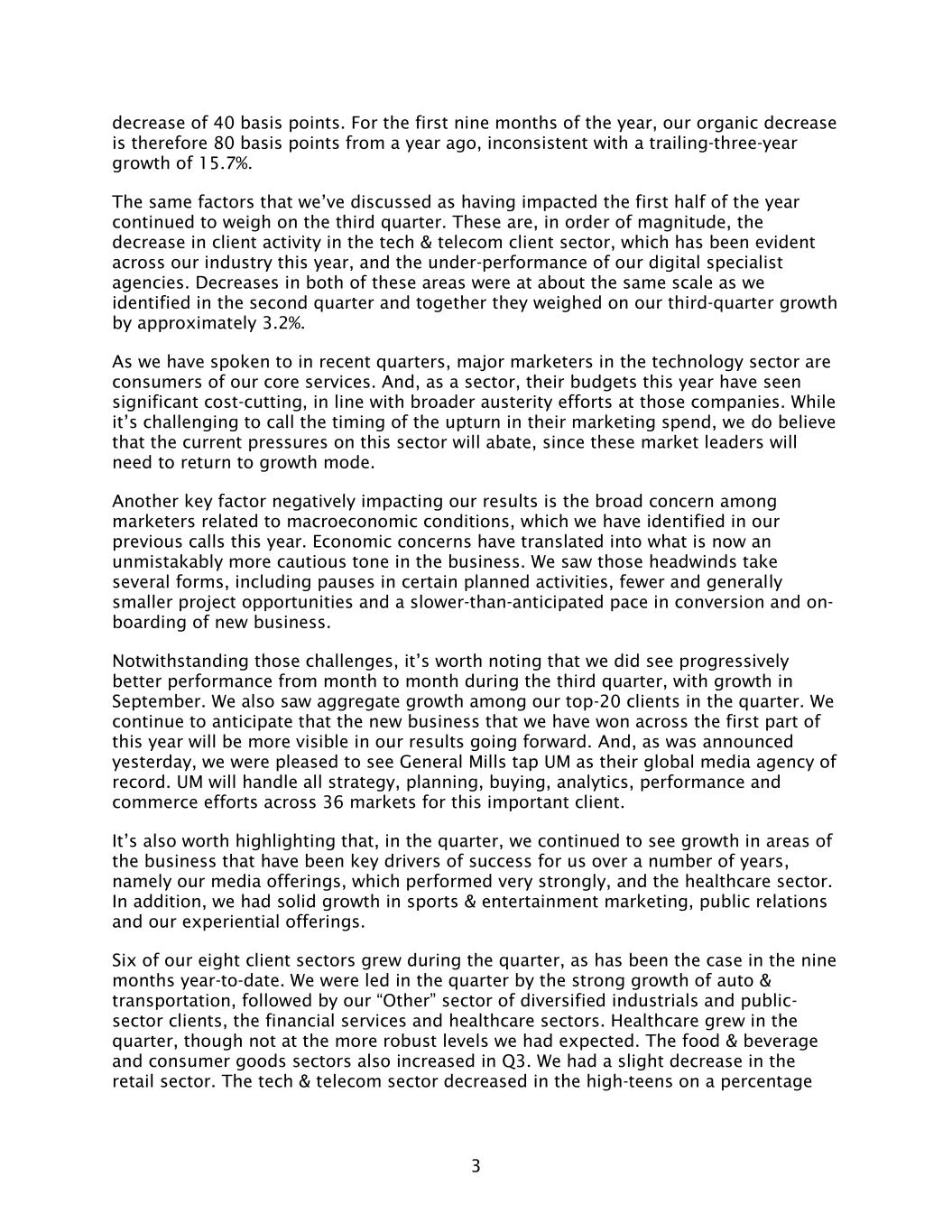 3 decrease of 40 basis points. For the first nine months of the year, our organic decrease is therefore 80 basis points from a year ago, inconsistent with a trailing-three-year growth of 15.7%. The same factors that we’ve discussed as having impacted the first half of the year continued to weigh on the third quarter. These are, in order of magnitude, the decrease in client activity in the tech & telecom client sector, which has been evident across our industry this year, and the under-performance of our digital specialist agencies. Decreases in both of these areas were at about the same scale as we identified in the second quarter and together they weighed on our third-quarter growth by approximately 3.2%. As we have spoken to in recent quarters, major marketers in the technology sector are consumers of our core services. And, as a sector, their budgets this year have seen significant cost-cutting, in line with broader austerity efforts at those companies. While it’s challenging to call the timing of the upturn in their marketing spend, we do believe that the current pressures on this sector will abate, since these market leaders will need to return to growth mode. Another key factor negatively impacting our results is the broad concern among marketers related to macroeconomic conditions, which we have identified in our previous calls this year. Economic concerns have translated into what is now an unmistakably more cautious tone in the business. We saw those headwinds take several forms, including pauses in certain planned activities, fewer and generally smaller project opportunities and a slower-than-anticipated pace in conversion and on- boarding of new business. Notwithstanding those challenges, it’s worth noting that we did see progressively better performance from month to month during the third quarter, with growth in September. We also saw aggregate growth among our top-20 clients in the quarter. We continue to anticipate that the new business that we have won across the first part of this year will be more visible in our results going forward. And, as was announced yesterday, we were pleased to see General Mills tap UM as their global media agency of record. UM will handle all strategy, planning, buying, analytics, performance and commerce efforts across 36 markets for this important client. It’s also worth highlighting that, in the quarter, we continued to see growth in areas of the business that have been key drivers of success for us over a number of years, namely our media offerings, which performed very strongly, and the healthcare sector. In addition, we had solid growth in sports & entertainment marketing, public relations and our experiential offerings. Six of our eight client sectors grew during the quarter, as has been the case in the nine months year-to-date. We were led in the quarter by the strong growth of auto & transportation, followed by our “Other” sector of diversified industrials and public- sector clients, the financial services and healthcare sectors. Healthcare grew in the quarter, though not at the more robust levels we had expected. The food & beverage and consumer goods sectors also increased in Q3. We had a slight decrease in the retail sector. The tech & telecom sector decreased in the high-teens on a percentage