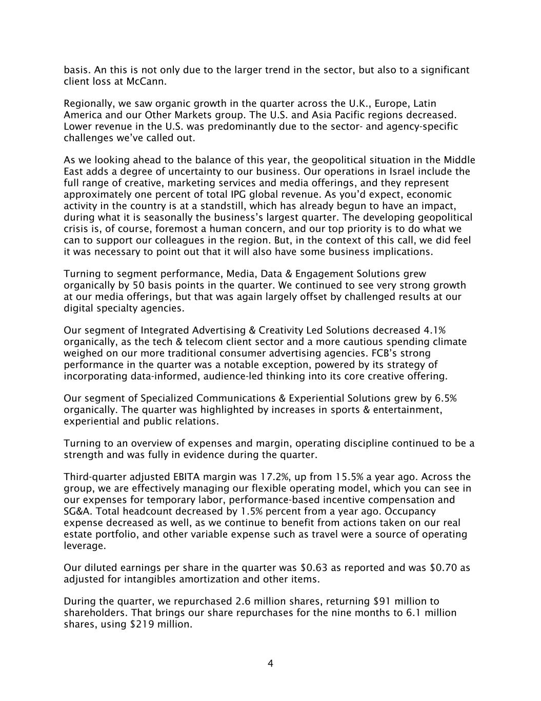 4 basis. An this is not only due to the larger trend in the sector, but also to a significant client loss at McCann. Regionally, we saw organic growth in the quarter across the U.K., Europe, Latin America and our Other Markets group. The U.S. and Asia Pacific regions decreased. Lower revenue in the U.S. was predominantly due to the sector- and agency-specific challenges we’ve called out. As we looking ahead to the balance of this year, the geopolitical situation in the Middle East adds a degree of uncertainty to our business. Our operations in Israel include the full range of creative, marketing services and media offerings, and they represent approximately one percent of total IPG global revenue. As you’d expect, economic activity in the country is at a standstill, which has already begun to have an impact, during what it is seasonally the business’s largest quarter. The developing geopolitical crisis is, of course, foremost a human concern, and our top priority is to do what we can to support our colleagues in the region. But, in the context of this call, we did feel it was necessary to point out that it will also have some business implications. Turning to segment performance, Media, Data & Engagement Solutions grew organically by 50 basis points in the quarter. We continued to see very strong growth at our media offerings, but that was again largely offset by challenged results at our digital specialty agencies. Our segment of Integrated Advertising & Creativity Led Solutions decreased 4.1% organically, as the tech & telecom client sector and a more cautious spending climate weighed on our more traditional consumer advertising agencies. FCB’s strong performance in the quarter was a notable exception, powered by its strategy of incorporating data-informed, audience-led thinking into its core creative offering. Our segment of Specialized Communications & Experiential Solutions grew by 6.5% organically. The quarter was highlighted by increases in sports & entertainment, experiential and public relations. Turning to an overview of expenses and margin, operating discipline continued to be a strength and was fully in evidence during the quarter. Third-quarter adjusted EBITA margin was 17.2%, up from 15.5% a year ago. Across the group, we are effectively managing our flexible operating model, which you can see in our expenses for temporary labor, performance-based incentive compensation and SG&A. Total headcount decreased by 1.5% percent from a year ago. Occupancy expense decreased as well, as we continue to benefit from actions taken on our real estate portfolio, and other variable expense such as travel were a source of operating leverage. Our diluted earnings per share in the quarter was $0.63 as reported and was $0.70 as adjusted for intangibles amortization and other items. During the quarter, we repurchased 2.6 million shares, returning $91 million to shareholders. That brings our share repurchases for the nine months to 6.1 million shares, using $219 million.