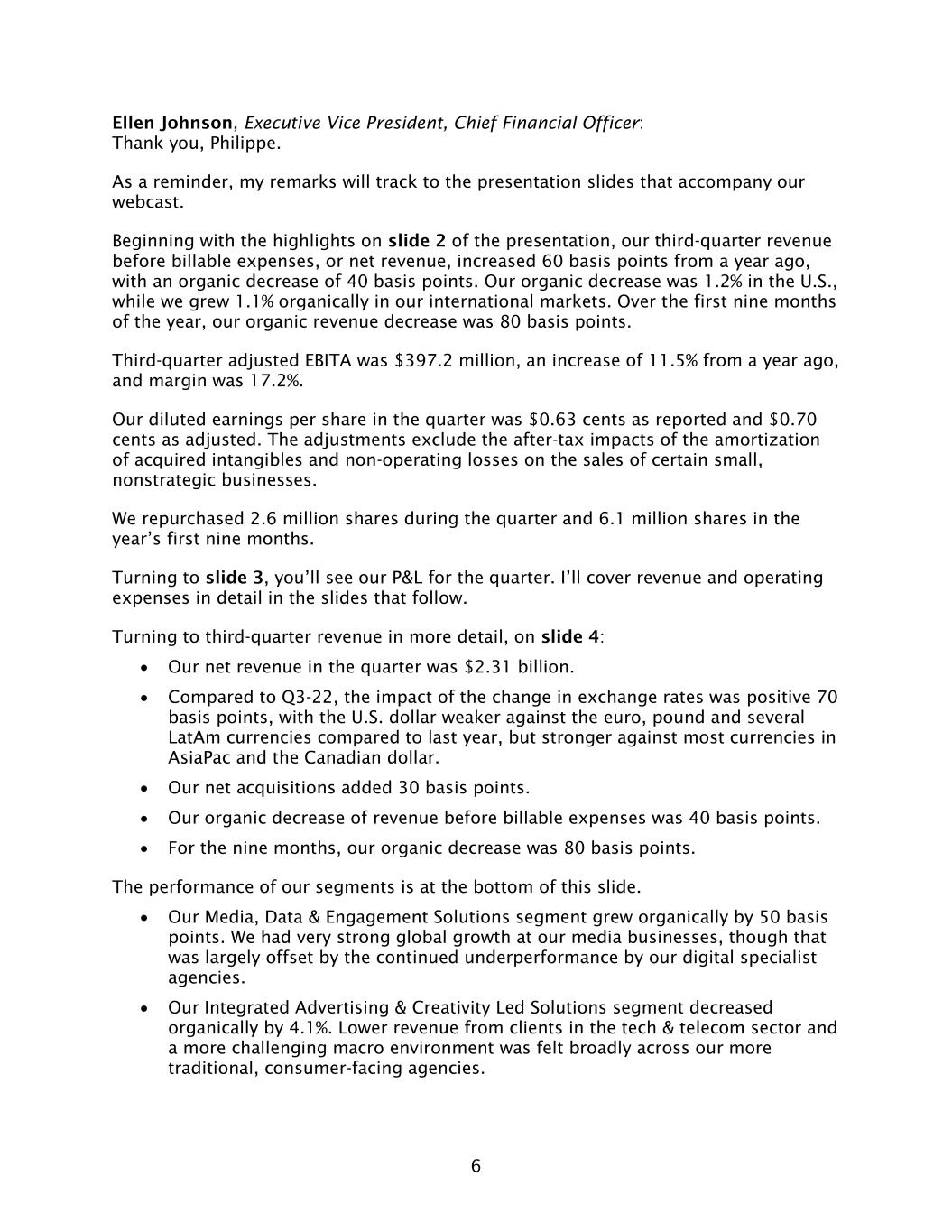 6 Ellen Johnson, Executive Vice President, Chief Financial Officer: Thank you, Philippe. As a reminder, my remarks will track to the presentation slides that accompany our webcast. Beginning with the highlights on slide 2 of the presentation, our third-quarter revenue before billable expenses, or net revenue, increased 60 basis points from a year ago, with an organic decrease of 40 basis points. Our organic decrease was 1.2% in the U.S., while we grew 1.1% organically in our international markets. Over the first nine months of the year, our organic revenue decrease was 80 basis points. Third-quarter adjusted EBITA was $397.2 million, an increase of 11.5% from a year ago, and margin was 17.2%. Our diluted earnings per share in the quarter was $0.63 cents as reported and $0.70 cents as adjusted. The adjustments exclude the after-tax impacts of the amortization of acquired intangibles and non-operating losses on the sales of certain small, nonstrategic businesses. We repurchased 2.6 million shares during the quarter and 6.1 million shares in the year’s first nine months. Turning to slide 3, you’ll see our P&L for the quarter. I’ll cover revenue and operating expenses in detail in the slides that follow. Turning to third-quarter revenue in more detail, on slide 4: • Our net revenue in the quarter was $2.31 billion. • Compared to Q3-22, the impact of the change in exchange rates was positive 70 basis points, with the U.S. dollar weaker against the euro, pound and several LatAm currencies compared to last year, but stronger against most currencies in AsiaPac and the Canadian dollar. • Our net acquisitions added 30 basis points. • Our organic decrease of revenue before billable expenses was 40 basis points. • For the nine months, our organic decrease was 80 basis points. The performance of our segments is at the bottom of this slide. • Our Media, Data & Engagement Solutions segment grew organically by 50 basis points. We had very strong global growth at our media businesses, though that was largely offset by the continued underperformance by our digital specialist agencies. • Our Integrated Advertising & Creativity Led Solutions segment decreased organically by 4.1%. Lower revenue from clients in the tech & telecom sector and a more challenging macro environment was felt broadly across our more traditional, consumer-facing agencies.