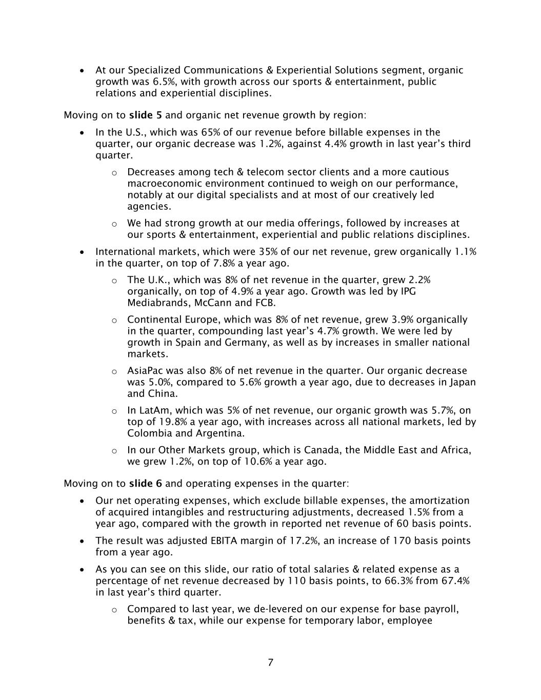 7 • At our Specialized Communications & Experiential Solutions segment, organic growth was 6.5%, with growth across our sports & entertainment, public relations and experiential disciplines. Moving on to slide 5 and organic net revenue growth by region: • In the U.S., which was 65% of our revenue before billable expenses in the quarter, our organic decrease was 1.2%, against 4.4% growth in last year’s third quarter. o Decreases among tech & telecom sector clients and a more cautious macroeconomic environment continued to weigh on our performance, notably at our digital specialists and at most of our creatively led agencies. o We had strong growth at our media offerings, followed by increases at our sports & entertainment, experiential and public relations disciplines. • International markets, which were 35% of our net revenue, grew organically 1.1% in the quarter, on top of 7.8% a year ago. o The U.K., which was 8% of net revenue in the quarter, grew 2.2% organically, on top of 4.9% a year ago. Growth was led by IPG Mediabrands, McCann and FCB. o Continental Europe, which was 8% of net revenue, grew 3.9% organically in the quarter, compounding last year’s 4.7% growth. We were led by growth in Spain and Germany, as well as by increases in smaller national markets. o AsiaPac was also 8% of net revenue in the quarter. Our organic decrease was 5.0%, compared to 5.6% growth a year ago, due to decreases in Japan and China. o In LatAm, which was 5% of net revenue, our organic growth was 5.7%, on top of 19.8% a year ago, with increases across all national markets, led by Colombia and Argentina. o In our Other Markets group, which is Canada, the Middle East and Africa, we grew 1.2%, on top of 10.6% a year ago. Moving on to slide 6 and operating expenses in the quarter: • Our net operating expenses, which exclude billable expenses, the amortization of acquired intangibles and restructuring adjustments, decreased 1.5% from a year ago, compared with the growth in reported net revenue of 60 basis points. • The result was adjusted EBITA margin of 17.2%, an increase of 170 basis points from a year ago. • As you can see on this slide, our ratio of total salaries & related expense as a percentage of net revenue decreased by 110 basis points, to 66.3% from 67.4% in last year’s third quarter. o Compared to last year, we de-levered on our expense for base payroll, benefits & tax, while our expense for temporary labor, employee