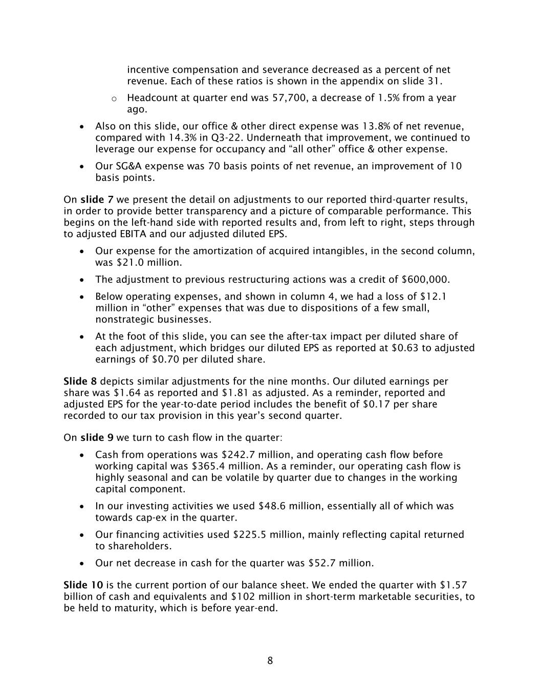 8 incentive compensation and severance decreased as a percent of net revenue. Each of these ratios is shown in the appendix on slide 31. o Headcount at quarter end was 57,700, a decrease of 1.5% from a year ago. • Also on this slide, our office & other direct expense was 13.8% of net revenue, compared with 14.3% in Q3-22. Underneath that improvement, we continued to leverage our expense for occupancy and “all other” office & other expense. • Our SG&A expense was 70 basis points of net revenue, an improvement of 10 basis points. On slide 7 we present the detail on adjustments to our reported third-quarter results, in order to provide better transparency and a picture of comparable performance. This begins on the left-hand side with reported results and, from left to right, steps through to adjusted EBITA and our adjusted diluted EPS. • Our expense for the amortization of acquired intangibles, in the second column, was $21.0 million. • The adjustment to previous restructuring actions was a credit of $600,000. • Below operating expenses, and shown in column 4, we had a loss of $12.1 million in “other” expenses that was due to dispositions of a few small, nonstrategic businesses. • At the foot of this slide, you can see the after-tax impact per diluted share of each adjustment, which bridges our diluted EPS as reported at $0.63 to adjusted earnings of $0.70 per diluted share. Slide 8 depicts similar adjustments for the nine months. Our diluted earnings per share was $1.64 as reported and $1.81 as adjusted. As a reminder, reported and adjusted EPS for the year-to-date period includes the benefit of $0.17 per share recorded to our tax provision in this year’s second quarter. On slide 9 we turn to cash flow in the quarter: • Cash from operations was $242.7 million, and operating cash flow before working capital was $365.4 million. As a reminder, our operating cash flow is highly seasonal and can be volatile by quarter due to changes in the working capital component. • In our investing activities we used $48.6 million, essentially all of which was towards cap-ex in the quarter. • Our financing activities used $225.5 million, mainly reflecting capital returned to shareholders. • Our net decrease in cash for the quarter was $52.7 million. Slide 10 is the current portion of our balance sheet. We ended the quarter with $1.57 billion of cash and equivalents and $102 million in short-term marketable securities, to be held to maturity, which is before year-end.
