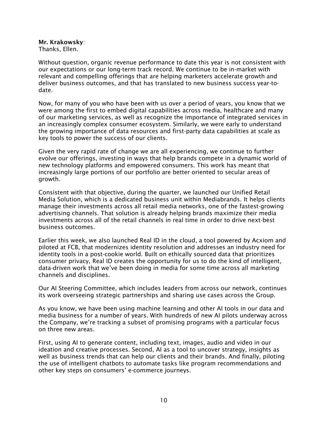 10 Mr. Krakowsky: Thanks, Ellen. Without question, organic revenue performance to date this year is not consistent with our expectations or our long-term track record. We continue to be in-market with relevant and compelling offerings that are helping marketers accelerate growth and deliver business outcomes, and that has translated to new business success year-to- date. Now, for many of you who have been with us over a period of years, you know that we were among the first to embed digital capabilities across media, healthcare and many of our marketing services, as well as recognize the importance of integrated services in an increasingly complex consumer ecosystem. Similarly, we were early to understand the growing importance of data resources and first-party data capabilities at scale as key tools to power the success of our clients. Given the very rapid rate of change we are all experiencing, we continue to further evolve our offerings, investing in ways that help brands compete in a dynamic world of new technology platforms and empowered consumers. This work has meant that increasingly large portions of our portfolio are better oriented to secular areas of growth. Consistent with that objective, during the quarter, we launched our Unified Retail Media Solution, which is a dedicated business unit within Mediabrands. It helps clients manage their investments across all retail media networks, one of the fastest-growing advertising channels. That solution is already helping brands maximize their media investments across all of the retail channels in real time in order to drive next-best business outcomes. Earlier this week, we also launched Real ID in the cloud, a tool powered by Acxiom and piloted at FCB, that modernizes identity resolution and addresses an industry need for identity tools in a post-cookie world. Built on ethically sourced data that prioritizes consumer privacy, Real ID creates the opportunity for us to do the kind of intelligent, data-driven work that we’ve been doing in media for some time across all marketing channels and disciplines. Our AI Steering Committee, which includes leaders from across our network, continues its work overseeing strategic partnerships and sharing use cases across the Group. As you know, we have been using machine learning and other AI tools in our data and media business for a number of years. With hundreds of new AI pilots underway across the Company, we’re tracking a subset of promising programs with a particular focus on three new areas. First, using AI to generate content, including text, images, audio and video in our ideation and creative processes. Second, AI as a tool to uncover strategy, insights as well as business trends that can help our clients and their brands. And finally, piloting the use of intelligent chatbots to automate tasks like program recommendations and other key steps on consumers’ e-commerce journeys.