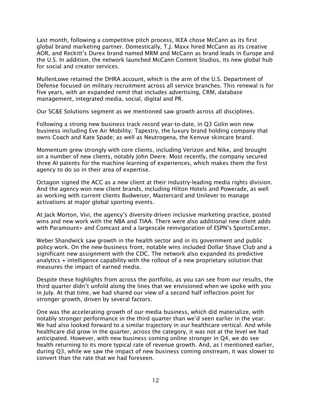 12 Last month, following a competitive pitch process, IKEA chose McCann as its first global brand marketing partner. Domestically, T.J. Maxx hired McCann as its creative AOR, and Reckitt’s Durex brand named MRM and McCann as brand leads in Europe and the U.S. In addition, the network launched McCann Content Studios, its new global hub for social and creator services. MullenLowe retained the DHRA account, which is the arm of the U.S. Department of Defense focused on military recruitment across all service branches. This renewal is for five years, with an expanded remit that includes advertising, CRM, database management, integrated media, social, digital and PR. Our SC&E Solutions segment as we mentioned saw growth across all disciplines. Following a strong new business track record year-to-date, in Q3 Golin won new business including Eve Air Mobility; Tapestry, the luxury brand holding company that owns Coach and Kate Spade; as well as Neutrogena, the Kenvue skincare brand. Momentum grew strongly with core clients, including Verizon and Nike, and brought on a number of new clients, notably John Deere. Most recently, the company secured three AI patents for the machine learning of experiences, which makes them the first agency to do so in their area of expertise. Octagon signed the ACC as a new client at their industry-leading media rights division. And the agency won new client brands, including Hilton Hotels and Powerade, as well as working with current clients Budweiser, Mastercard and Unilever to manage activations at major global sporting events. At Jack Morton, Vivi, the agency’s diversity-driven inclusive marketing practice, posted wins and new work with the NBA and TIAA. There were also additional new client adds with Paramount+ and Comcast and a largescale reinvigoration of ESPN’s SportsCenter. Weber Shandwick saw growth in the health sector and in its government and public policy work. On the new-business front, notable wins included Dollar Shave Club and a significant new assignment with the CDC. The network also expanded its predictive analytics + intelligence capability with the rollout of a new proprietary solution that measures the impact of earned media. Despite these highlights from across the portfolio, as you can see from our results, the third quarter didn’t unfold along the lines that we envisioned when we spoke with you in July. At that time, we had shared our view of a second half inflection point for stronger growth, driven by several factors. One was the accelerating growth of our media business, which did materialize, with notably stronger performance in the third quarter than we’d seen earlier in the year. We had also looked forward to a similar trajectory in our healthcare vertical. And while healthcare did grow in the quarter, across the category, it was not at the level we had anticipated. However, with new business coming online stronger in Q4, we do see health returning to its more typical rate of revenue growth. And, as I mentioned earlier, during Q3, while we saw the impact of new business coming onstream, it was slower to convert than the rate that we had foreseen.