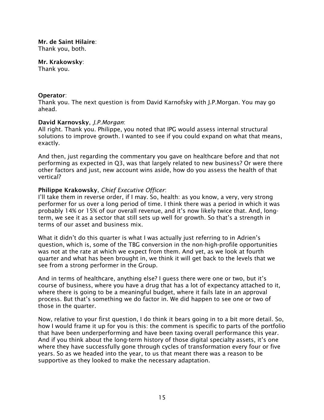 15 Mr. de Saint Hilaire: Thank you, both. Mr. Krakowsky: Thank you. Operator: Thank you. The next question is from David Karnofsky with J.P.Morgan. You may go ahead. David Karnovsky, J.P.Morgan: All right. Thank you. Philippe, you noted that IPG would assess internal structural solutions to improve growth. I wanted to see if you could expand on what that means, exactly. And then, just regarding the commentary you gave on healthcare before and that not performing as expected in Q3, was that largely related to new business? Or were there other factors and just, new account wins aside, how do you assess the health of that vertical? Philippe Krakowsky, Chief Executive Officer: I’ll take them in reverse order, if I may. So, health: as you know, a very, very strong performer for us over a long period of time. I think there was a period in which it was probably 14% or 15% of our overall revenue, and it’s now likely twice that. And, long- term, we see it as a sector that still sets up well for growth. So that’s a strength in terms of our asset and business mix. What it didn’t do this quarter is what I was actually just referring to in Adrien’s question, which is, some of the TBG conversion in the non-high-profile opportunities was not at the rate at which we expect from them. And yet, as we look at fourth quarter and what has been brought in, we think it will get back to the levels that we see from a strong performer in the Group. And in terms of healthcare, anything else? I guess there were one or two, but it’s course of business, where you have a drug that has a lot of expectancy attached to it, where there is going to be a meaningful budget, where it fails late in an approval process. But that’s something we do factor in. We did happen to see one or two of those in the quarter. Now, relative to your first question, I do think it bears going in to a bit more detail. So, how I would frame it up for you is this: the comment is specific to parts of the portfolio that have been underperforming and have been taxing overall performance this year. And if you think about the long-term history of those digital specialty assets, it’s one where they have successfully gone through cycles of transformation every four or five years. So as we headed into the year, to us that meant there was a reason to be supportive as they looked to make the necessary adaptation.