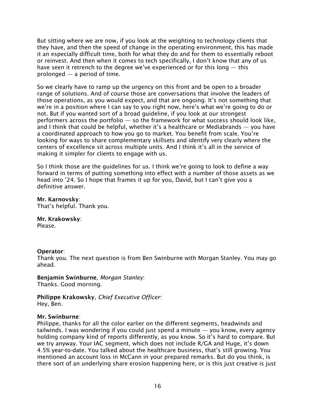16 But sitting where we are now, if you look at the weighting to technology clients that they have, and then the speed of change in the operating environment, this has made it an especially difficult time, both for what they do and for them to essentially reboot or reinvest. And then when it comes to tech specifically, I don’t know that any of us have seen it retrench to the degree we’ve experienced or for this long — this prolonged — a period of time. So we clearly have to ramp up the urgency on this front and be open to a broader range of solutions. And of course those are conversations that involve the leaders of those operations, as you would expect, and that are ongoing. It’s not something that we’re in a position where I can say to you right now, here’s what we’re going to do or not. But if you wanted sort of a broad guideline, if you look at our strongest performers across the portfolio — so the framework for what success should look like, and I think that could be helpful, whether it’s a healthcare or Mediabrands — you have a coordinated approach to how you go to market. You benefit from scale. You’re looking for ways to share complementary skillsets and identify very clearly where the centers of excellence sit across multiple units. And I think it’s all in the service of making it simpler for clients to engage with us. So I think those are the guidelines for us. I think we’re going to look to define a way forward in terms of putting something into effect with a number of those assets as we head into ’24. So I hope that frames it up for you, David, but I can’t give you a definitive answer. Mr. Karnovsky: That’s helpful. Thank you. Mr. Krakowsky: Please. Operator: Thank you. The next question is from Ben Swinburne with Morgan Stanley. You may go ahead. Benjamin Swinburne, Morgan Stanley: Thanks. Good morning. Philippe Krakowsky, Chief Executive Officer: Hey, Ben. Mr. Swinburne: Philippe, thanks for all the color earlier on the different segments, headwinds and tailwinds. I was wondering if you could just spend a minute — you know, every agency holding company kind of reports differently, as you know. So it’s hard to compare. But we try anyway. Your IAC segment, which does not include R/GA and Huge, it’s down 4.5% year-to-date. You talked about the healthcare business, that’s still growing. You mentioned an account loss in McCann in your prepared remarks. But do you think, is there sort of an underlying share erosion happening here, or is this just creative is just