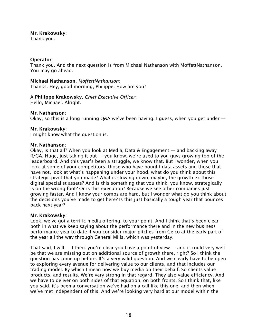 18 Mr. Krakowsky: Thank you. Operator: Thank you. And the next question is from Michael Nathanson with MoffettNathanson. You may go ahead. Michael Nathanson, MoffettNathanson: Thanks. Hey, good morning, Philippe. How are you? A Philippe Krakowsky, Chief Executive Officer: Hello, Michael. Alright. Mr. Nathanson: Okay, so this is a long running Q&A we’ve been having. I guess, when you get under — Mr. Krakowsky: I might know what the question is. Mr. Nathanson: Okay, is that all? When you look at Media, Data & Engagement — and backing away R/GA, Huge, just taking it out — you know, we’re used to you guys growing top of the leaderboard. And this year’s been a struggle, we know that. But I wonder, when you look at some of your competitors, those who have bought data assets and those that have not, look at what’s happening under your hood, what do you think about this strategic pivot that you made? What is slowing down, maybe, the growth ex those digital specialist assets? And is this something that you think, you know, strategically is on the wrong foot? Or is this execution? Because we see other companies just growing faster. And I know your comps are hard, but I wonder what do you think about the decisions you’ve made to get here? Is this just basically a tough year that bounces back next year? Mr. Krakowsky: Look, we’ve got a terrific media offering, to your point. And I think that’s been clear both in what we keep saying about the performance there and in the new business performance year-to-date if you consider major pitches from Geico at the early part of the year all the way through General Mills, which was yesterday. That said, I will — I think you’re clear you have a point-of-view — and it could very well be that we are missing out on additional source of growth there, right? So I think the question has come up before. It’s a very valid question. And we clearly have to be open to exploring every avenue for delivering value to our clients, and that includes our trading model. By which I mean how we buy media on their behalf. So clients value products, and results. We’re very strong in that regard. They also value efficiency. And we have to deliver on both sides of that equation, on both fronts. So I think that, like you said, it’s been a conversation we’ve had on a call like this one, and then when we’ve met independent of this. And we’re looking very hard at our model within the