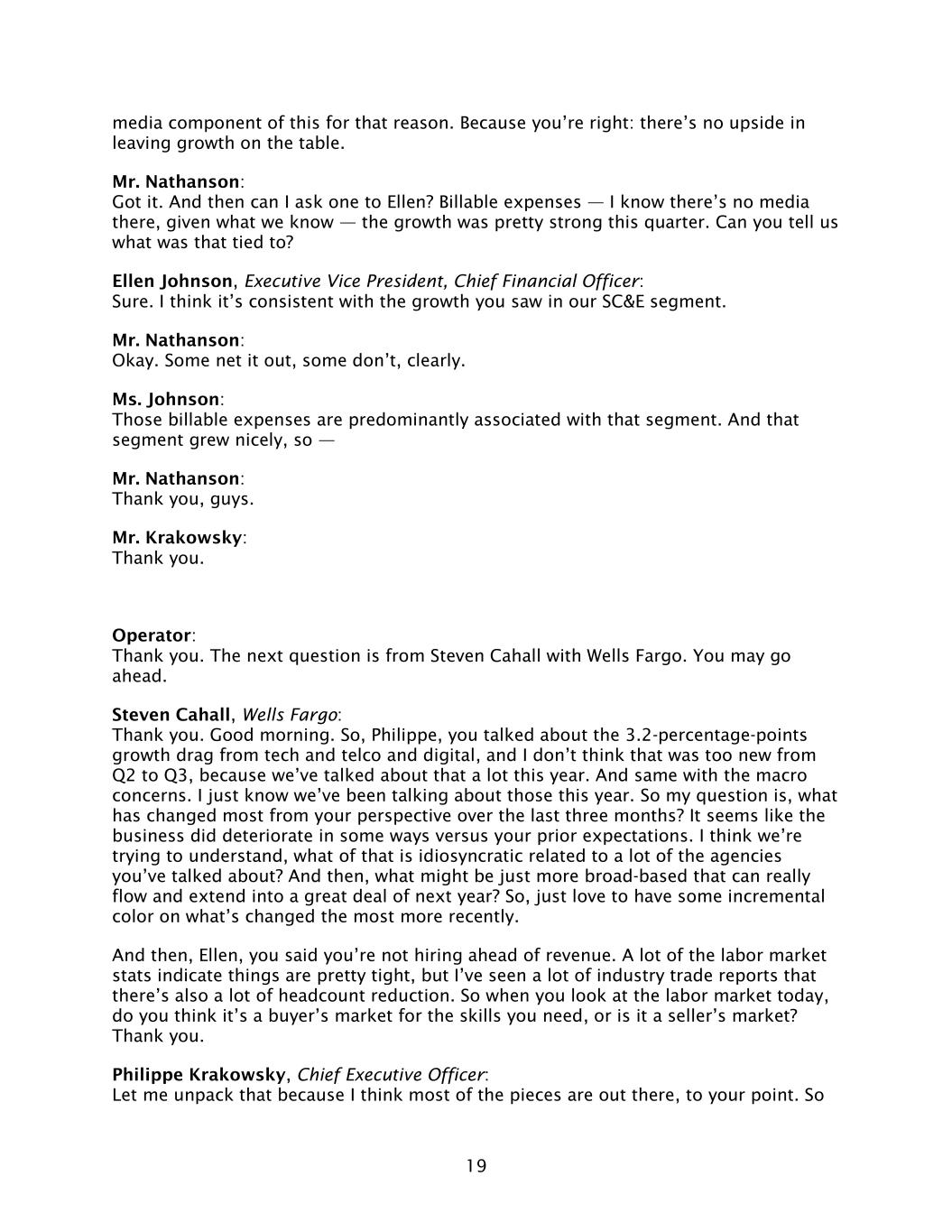 19 media component of this for that reason. Because you’re right: there’s no upside in leaving growth on the table. Mr. Nathanson: Got it. And then can I ask one to Ellen? Billable expenses — I know there’s no media there, given what we know — the growth was pretty strong this quarter. Can you tell us what was that tied to? Ellen Johnson, Executive Vice President, Chief Financial Officer: Sure. I think it’s consistent with the growth you saw in our SC&E segment. Mr. Nathanson: Okay. Some net it out, some don’t, clearly. Ms. Johnson: Those billable expenses are predominantly associated with that segment. And that segment grew nicely, so — Mr. Nathanson: Thank you, guys. Mr. Krakowsky: Thank you. Operator: Thank you. The next question is from Steven Cahall with Wells Fargo. You may go ahead. Steven Cahall, Wells Fargo: Thank you. Good morning. So, Philippe, you talked about the 3.2-percentage-points growth drag from tech and telco and digital, and I don’t think that was too new from Q2 to Q3, because we’ve talked about that a lot this year. And same with the macro concerns. I just know we’ve been talking about those this year. So my question is, what has changed most from your perspective over the last three months? It seems like the business did deteriorate in some ways versus your prior expectations. I think we’re trying to understand, what of that is idiosyncratic related to a lot of the agencies you’ve talked about? And then, what might be just more broad-based that can really flow and extend into a great deal of next year? So, just love to have some incremental color on what’s changed the most more recently. And then, Ellen, you said you’re not hiring ahead of revenue. A lot of the labor market stats indicate things are pretty tight, but I’ve seen a lot of industry trade reports that there’s also a lot of headcount reduction. So when you look at the labor market today, do you think it’s a buyer’s market for the skills you need, or is it a seller’s market? Thank you. Philippe Krakowsky, Chief Executive Officer: Let me unpack that because I think most of the pieces are out there, to your point. So