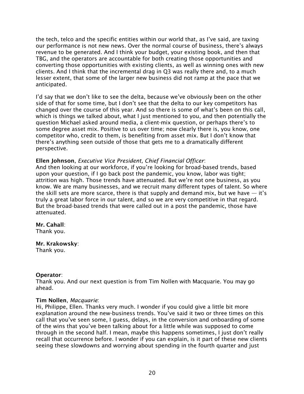 20 the tech, telco and the specific entities within our world that, as I’ve said, are taxing our performance is not new news. Over the normal course of business, there’s always revenue to be generated. And I think your budget, your existing book, and then that TBG, and the operators are accountable for both creating those opportunities and converting those opportunities with existing clients, as well as winning ones with new clients. And I think that the incremental drag in Q3 was really there and, to a much lesser extent, that some of the larger new business did not ramp at the pace that we anticipated. I’d say that we don’t like to see the delta, because we’ve obviously been on the other side of that for some time, but I don’t see that the delta to our key competitors has changed over the course of this year. And so there is some of what’s been on this call, which is things we talked about, what I just mentioned to you, and then potentially the question Michael asked around media, a client-mix question, or perhaps there’s to some degree asset mix. Positive to us over time; now clearly there is, you know, one competitor who, credit to them, is benefiting from asset mix. But I don’t know that there’s anything seen outside of those that gets me to a dramatically different perspective. Ellen Johnson, Executive Vice President, Chief Financial Officer: And then looking at our workforce, if you’re looking for broad-based trends, based upon your question, if I go back post the pandemic, you know, labor was tight; attrition was high. Those trends have attenuated. But we’re not one business, as you know. We are many businesses, and we recruit many different types of talent. So where the skill sets are more scarce, there is that supply and demand mix, but we have — it’s truly a great labor force in our talent, and so we are very competitive in that regard. But the broad-based trends that were called out in a post the pandemic, those have attenuated. Mr. Cahall: Thank you. Mr. Krakowsky: Thank you. Operator: Thank you. And our next question is from Tim Nollen with Macquarie. You may go ahead. Tim Nollen, Macquarie: Hi, Philippe, Ellen. Thanks very much. I wonder if you could give a little bit more explanation around the new-business trends. You’ve said it two or three times on this call that you’ve seen some, I guess, delays, in the conversion and onboarding of some of the wins that you’ve been talking about for a little while was supposed to come through in the second half. I mean, maybe this happens sometimes, I just don’t really recall that occurrence before. I wonder if you can explain, is it part of these new clients seeing these slowdowns and worrying about spending in the fourth quarter and just