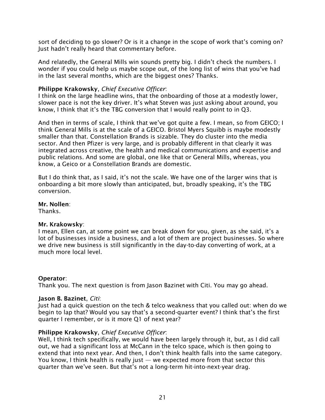 21 sort of deciding to go slower? Or is it a change in the scope of work that’s coming on? Just hadn’t really heard that commentary before. And relatedly, the General Mills win sounds pretty big. I didn’t check the numbers. I wonder if you could help us maybe scope out, of the long list of wins that you’ve had in the last several months, which are the biggest ones? Thanks. Philippe Krakowsky, Chief Executive Officer: I think on the large headline wins, that the onboarding of those at a modestly lower, slower pace is not the key driver. It’s what Steven was just asking about around, you know, I think that it’s the TBG conversion that I would really point to in Q3. And then in terms of scale, I think that we’ve got quite a few. I mean, so from GEICO; I think General Mills is at the scale of a GEICO. Bristol Myers Squibb is maybe modestly smaller than that. Constellation Brands is sizable. They do cluster into the media sector. And then Pfizer is very large, and is probably different in that clearly it was integrated across creative, the health and medical communications and expertise and public relations. And some are global, one like that or General Mills, whereas, you know, a Geico or a Constellation Brands are domestic. But I do think that, as I said, it’s not the scale. We have one of the larger wins that is onboarding a bit more slowly than anticipated, but, broadly speaking, it’s the TBG conversion. Mr. Nollen: Thanks. Mr. Krakowsky: I mean, Ellen can, at some point we can break down for you, given, as she said, it’s a lot of businesses inside a business, and a lot of them are project businesses. So where we drive new business is still significantly in the day-to-day converting of work, at a much more local level. Operator: Thank you. The next question is from Jason Bazinet with Citi. You may go ahead. Jason B. Bazinet, Citi: Just had a quick question on the tech & telco weakness that you called out: when do we begin to lap that? Would you say that’s a second-quarter event? I think that’s the first quarter I remember, or is it more Q1 of next year? Philippe Krakowsky, Chief Executive Officer: Well, I think tech specifically, we would have been largely through it, but, as I did call out, we had a significant loss at McCann in the telco space, which is then going to extend that into next year. And then, I don’t think health falls into the same category. You know, I think health is really just — we expected more from that sector this quarter than we’ve seen. But that’s not a long-term hit-into-next-year drag.
