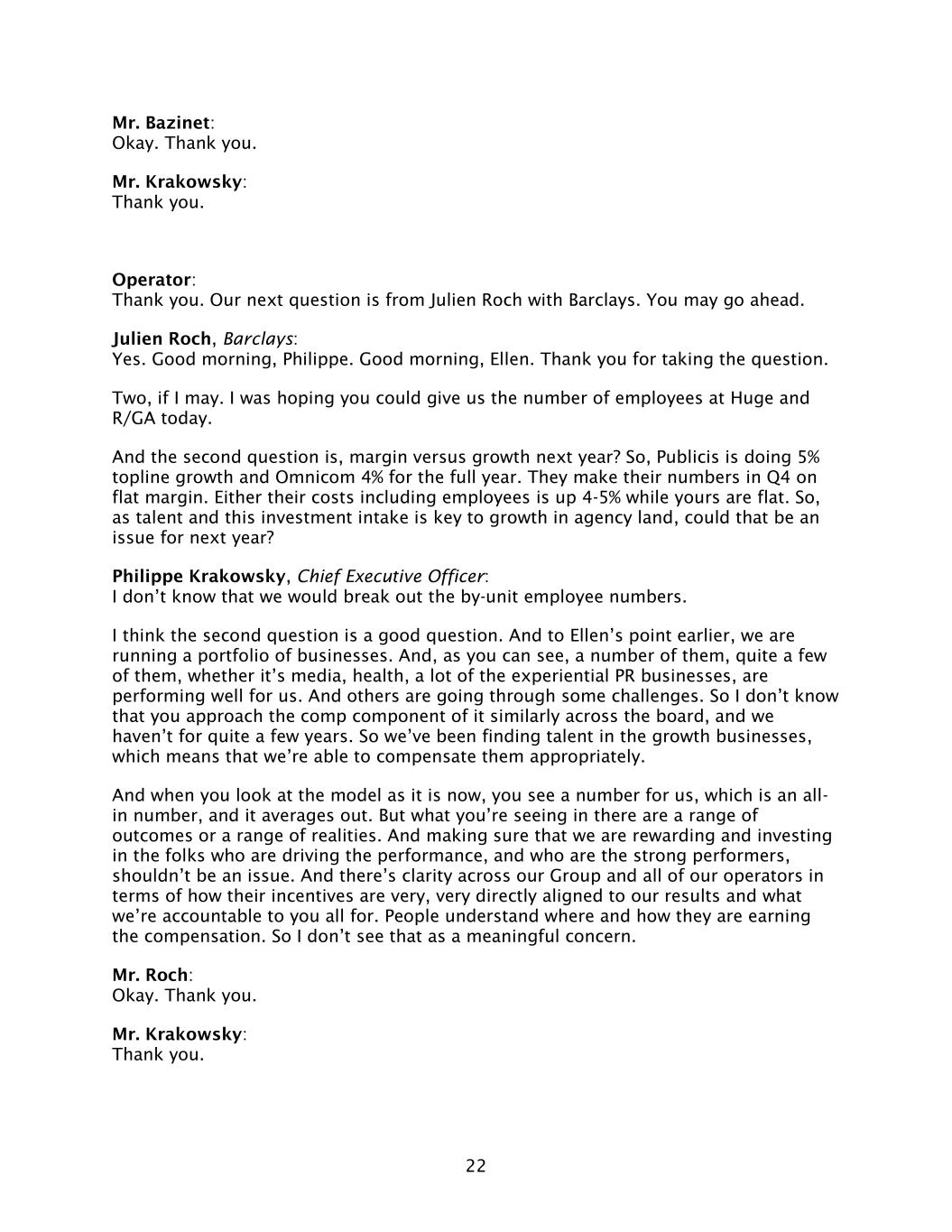 22 Mr. Bazinet: Okay. Thank you. Mr. Krakowsky: Thank you. Operator: Thank you. Our next question is from Julien Roch with Barclays. You may go ahead. Julien Roch, Barclays: Yes. Good morning, Philippe. Good morning, Ellen. Thank you for taking the question. Two, if I may. I was hoping you could give us the number of employees at Huge and R/GA today. And the second question is, margin versus growth next year? So, Publicis is doing 5% topline growth and Omnicom 4% for the full year. They make their numbers in Q4 on flat margin. Either their costs including employees is up 4-5% while yours are flat. So, as talent and this investment intake is key to growth in agency land, could that be an issue for next year? Philippe Krakowsky, Chief Executive Officer: I don’t know that we would break out the by-unit employee numbers. I think the second question is a good question. And to Ellen’s point earlier, we are running a portfolio of businesses. And, as you can see, a number of them, quite a few of them, whether it’s media, health, a lot of the experiential PR businesses, are performing well for us. And others are going through some challenges. So I don’t know that you approach the comp component of it similarly across the board, and we haven’t for quite a few years. So we’ve been finding talent in the growth businesses, which means that we’re able to compensate them appropriately. And when you look at the model as it is now, you see a number for us, which is an all- in number, and it averages out. But what you’re seeing in there are a range of outcomes or a range of realities. And making sure that we are rewarding and investing in the folks who are driving the performance, and who are the strong performers, shouldn’t be an issue. And there’s clarity across our Group and all of our operators in terms of how their incentives are very, very directly aligned to our results and what we’re accountable to you all for. People understand where and how they are earning the compensation. So I don’t see that as a meaningful concern. Mr. Roch: Okay. Thank you. Mr. Krakowsky: Thank you.
