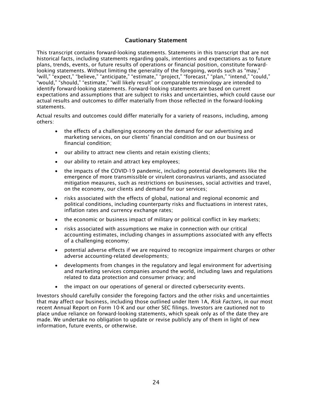24 Cautionary Statement This transcript contains forward-looking statements. Statements in this transcript that are not historical facts, including statements regarding goals, intentions and expectations as to future plans, trends, events, or future results of operations or financial position, constitute forward- looking statements. Without limiting the generality of the foregoing, words such as “may,” “will,” “expect,” “believe,” “anticipate,” “estimate,” “project,” “forecast,” “plan,” “intend,” “could,” “would,” “should,” “estimate,” “will likely result” or comparable terminology are intended to identify forward-looking statements. Forward-looking statements are based on current expectations and assumptions that are subject to risks and uncertainties, which could cause our actual results and outcomes to differ materially from those reflected in the forward-looking statements. Actual results and outcomes could differ materially for a variety of reasons, including, among others: • the effects of a challenging economy on the demand for our advertising and marketing services, on our clients’ financial condition and on our business or financial condition; • our ability to attract new clients and retain existing clients; • our ability to retain and attract key employees; • the impacts of the COVID-19 pandemic, including potential developments like the emergence of more transmissible or virulent coronavirus variants, and associated mitigation measures, such as restrictions on businesses, social activities and travel, on the economy, our clients and demand for our services; • risks associated with the effects of global, national and regional economic and political conditions, including counterparty risks and fluctuations in interest rates, inflation rates and currency exchange rates; • the economic or business impact of military or political conflict in key markets; • risks associated with assumptions we make in connection with our critical accounting estimates, including changes in assumptions associated with any effects of a challenging economy; • potential adverse effects if we are required to recognize impairment charges or other adverse accounting-related developments; • developments from changes in the regulatory and legal environment for advertising and marketing services companies around the world, including laws and regulations related to data protection and consumer privacy; and • the impact on our operations of general or directed cybersecurity events. Investors should carefully consider the foregoing factors and the other risks and uncertainties that may affect our business, including those outlined under Item 1A, Risk Factors, in our most recent Annual Report on Form 10-K and our other SEC filings. Investors are cautioned not to place undue reliance on forward-looking statements, which speak only as of the date they are made. We undertake no obligation to update or revise publicly any of them in light of new information, future events, or otherwise.