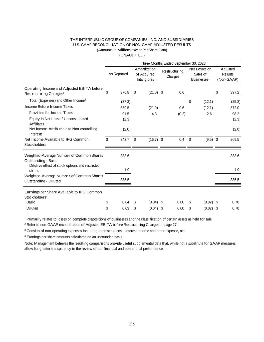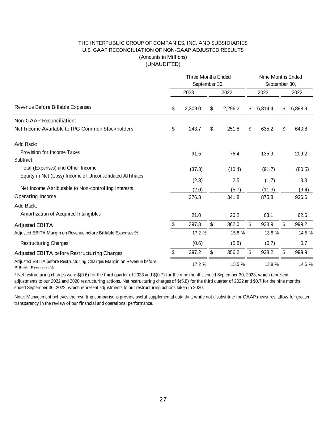 26 THE INTERPUBLIC GROUP OF COMPANIES, INC. AND SUBSIDIARIES U.S. GAAP RECONCILIATION OF NON-GAAP ADJUSTED RESULTS (Amounts in Millions except Per Share Data) (UNAUDITED) Nine Months Ended September 30, 2023 As Reported Amortization of Acquired Intangibles Restructuring Charges Net Losses on Sales of Businesses1 Adjusted Results (Non-GAAP) Operating Income and Adjusted EBITA before Restructuring Charges2 $ 875.8 $ (63.1) $ 0.7 $ 938.2 Total (Expenses) and Other Income3 (91.7) $ (20.4) (71.3) Income Before Income Taxes 784.1 (63.1) 0.7 (20.4) 866.9 Provision for Income Taxes 135.9 12.7 (0.3) 4.0 152.3 Equity in Net Loss of Unconsolidated Affiliates (1.7) (1.7) Net Income Attributable to Non-controlling Interests (11.3) (11.3) Net Income Available to IPG Common Stockholders $ 635.2 $ (50.4) $ 0.4 $ (16.4) $ 701.6 Weighted-Average Number of Common Shares Outstanding - Basic 385.0 385.0 Dilutive effect of stock options and restricted shares 1.8 1.8 Weighted-Average Number of Common Shares Outstanding - Diluted 386.8 386.8 Earnings per Share Available to IPG Common Stockholders4,5: Basic $ 1.65 $ (0.13) $ 0.00 $ (0.04) $ 1.82 Diluted $ 1.64 $ (0.13) $ 0.00 $ (0.04) $ 1.81 1 Primarily relates to losses on complete dispositions of businesses and the classification of certain assets as held for sale, as well as a loss related to the sale of an equity investment. 2 Refer to non-GAAP reconciliation of Adjusted EBITA before Restructuring Charges on page 27. 3 Consists of non-operating expenses including interest expense, interest income and other expense, net. 4 Earnings per share amounts calculated on an unrounded basis. 5 Basic and diluted earnings per share, both As Reported and Adjusted Results (Non-GAAP), includes a positive impact of $0.17 related to the settlement of U.S. Federal Income Tax Audits for the years 2017-2018. Note: Management believes the resulting comparisons provide useful supplemental data that, while not a substitute for GAAP measures, allow for greater transparency in the review of our financial and operational performance.