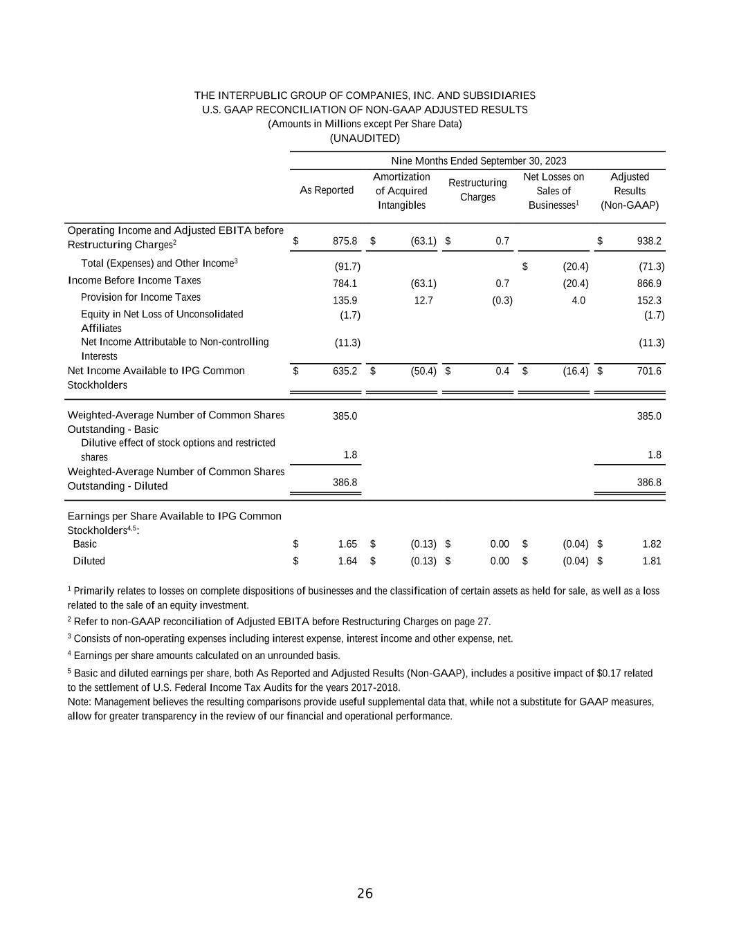 25 THE INTERPUBLIC GROUP OF COMPANIES, INC. AND SUBSIDIARIES U.S. GAAP RECONCILIATION OF NON-GAAP ADJUSTED RESULTS (Amounts in Millions except Per Share Data) (UNAUDITED) Three Months Ended September 30, 2023 As Reported Amortization of Acquired Intangibles Restructuring Charges Net Losses on Sales of Businesses1 Adjusted Results (Non-GAAP) Operating Income and Adjusted EBITA before Restructuring Charges2 $ 376.8 $ (21.0) $ 0.6 $ 397.2 Total (Expenses) and Other Income3 (37.3) $ (12.1) (25.2) Income Before Income Taxes 339.5 (21.0) 0.6 (12.1) 372.0 Provision for Income Taxes 91.5 4.3 (0.2) 2.6 98.2 Equity in Net Loss of Unconsolidated Affiliates (2.3) (2.3) Net Income Attributable to Non-controlling Interests (2.0) (2.0) Net Income Available to IPG Common Stockholders $ 243.7 $ (16.7) $ 0.4 $ (9.5) $ 269.5 Weighted-Average Number of Common Shares Outstanding - Basic 383.6 383.6 Dilutive effect of stock options and restricted shares 1.9 1.9 Weighted-Average Number of Common Shares Outstanding - Diluted 385.5 385.5 Earnings per Share Available to IPG Common Stockholders4: Basic $ 0.64 $ (0.04) $ 0.00 $ (0.02) $ 0.70 Diluted $ 0.63 $ (0.04) $ 0.00 $ (0.02) $ 0.70 1 Primarily relates to losses on complete dispositions of businesses and the classification of certain assets as held for sale. 2 Refer to non-GAAP reconciliation of Adjusted EBITA before Restructuring Charges on page 27. 3 Consists of non-operating expenses including interest expense, interest income and other expense, net. 4 Earnings per share amounts calculated on an unrounded basis. Note: Management believes the resulting comparisons provide useful supplemental data that, while not a substitute for GAAP measures, allow for greater transparency in the review of our financial and operational performance.