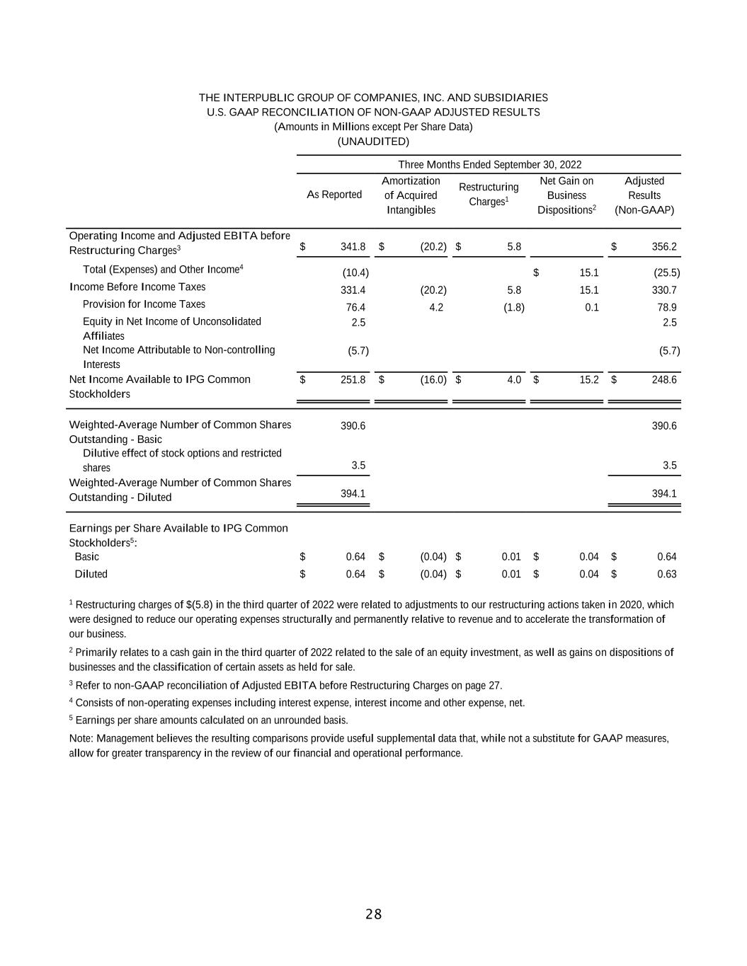 27 THE INTERPUBLIC GROUP OF COMPANIES, INC. AND SUBSIDIARIES U.S. GAAP RECONCILIATION OF NON-GAAP ADJUSTED RESULTS (Amounts in Millions) (UNAUDITED) Three Months Ended September 30, Nine Months Ended September 30, 2023 2022 2023 2022 Revenue Before Billable Expenses $ 2,309.0 $ 2,296.2 $ 6,814.4 $ 6,898.9 Non-GAAP Reconciliation: Net Income Available to IPG Common Stockholders $ 243.7 $ 251.8 $ 635.2 $ 640.8 Add Back: Provision for Income Taxes 91.5 76.4 135.9 209.2 Subtract: Total (Expenses) and Other Income (37.3) (10.4) (91.7) (80.5) Equity in Net (Loss) Income of Unconsolidated Affiliates (2.3) 2.5 (1.7) 3.3 Net Income Attributable to Non-controlling Interests (2.0) (5.7) (11.3) (9.4) Operating Income 376.8 341.8 875.8 936.6 Add Back: Amortization of Acquired Intangibles 21.0 20.2 63.1 62.6 Adjusted EBITA $ 397.8 $ 362.0 $ 938.9 $ 999.2 Adjusted EBITA Margin on Revenue before Billable Expenses % 17.2 % 15.8 % 13.8 % 14.5 % Restructuring Charges1 (0.6) (5.8) (0.7) 0.7 Adjusted EBITA before Restructuring Charges $ 397.2 $ 356.2 $ 938.2 $ 999.9 Adjusted EBITA before Restructuring Charges Margin on Revenue before Billable Expenses % 17.2 % 15.5 % 13.8 % 14.5 % 1 Net restructuring charges were $(0.6) for the third quarter of 2023 and $(0.7) for the nine months ended September 30, 2023, which represent adjustments to our 2022 and 2020 restructuring actions. Net restructuring charges of $(5.8) for the third quarter of 2022 and $0.7 for the nine months ended September 30, 2022, which represent adjustments to our restructuring actions taken in 2020. Note: Management believes the resulting comparisons provide useful supplemental data that, while not a substitute for GAAP measures, allow for greater transparency in the review of our financial and operational performance.