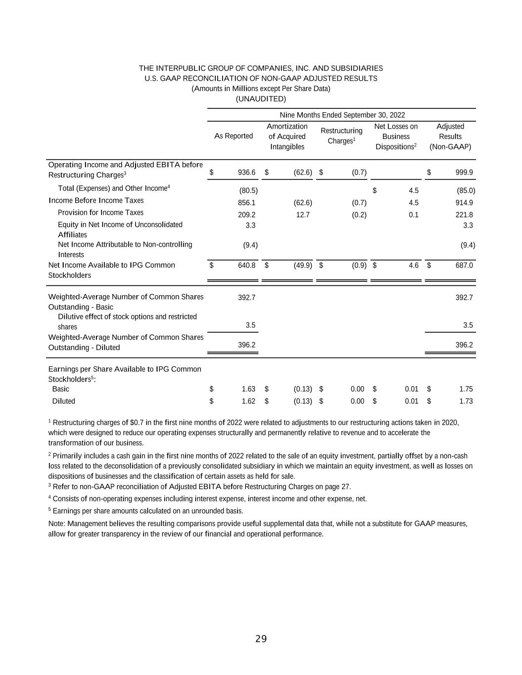 28 THE INTERPUBLIC GROUP OF COMPANIES, INC. AND SUBSIDIARIES U.S. GAAP RECONCILIATION OF NON-GAAP ADJUSTED RESULTS (Amounts in Millions except Per Share Data) (UNAUDITED) Three Months Ended September 30, 2022 As Reported Amortization of Acquired Intangibles Restructuring Charges1 Net Gain on Business Dispositions2 Adjusted Results (Non-GAAP) Operating Income and Adjusted EBITA before Restructuring Charges3 $ 341.8 $ (20.2) $ 5.8 $ 356.2 Total (Expenses) and Other Income4 (10.4) $ 15.1 (25.5) Income Before Income Taxes 331.4 (20.2) 5.8 15.1 330.7 Provision for Income Taxes 76.4 4.2 (1.8) 0.1 78.9 Equity in Net Income of Unconsolidated Affiliates 2.5 2.5 Net Income Attributable to Non-controlling Interests (5.7) (5.7) Net Income Available to IPG Common Stockholders $ 251.8 $ (16.0) $ 4.0 $ 15.2 $ 248.6 Weighted-Average Number of Common Shares Outstanding - Basic 390.6 390.6 Dilutive effect of stock options and restricted shares 3.5 3.5 Weighted-Average Number of Common Shares Outstanding - Diluted 394.1 394.1 Earnings per Share Available to IPG Common Stockholders5: Basic $ 0.64 $ (0.04) $ 0.01 $ 0.04 $ 0.64 Diluted $ 0.64 $ (0.04) $ 0.01 $ 0.04 $ 0.63 1 Restructuring charges of $(5.8) in the third quarter of 2022 were related to adjustments to our restructuring actions taken in 2020, which were designed to reduce our operating expenses structurally and permanently relative to revenue and to accelerate the transformation of our business. 2 Primarily relates to a cash gain in the third quarter of 2022 related to the sale of an equity investment, as well as gains on dispositions of businesses and the classification of certain assets as held for sale. 3 Refer to non-GAAP reconciliation of Adjusted EBITA before Restructuring Charges on page 27. 4 Consists of non-operating expenses including interest expense, interest income and other expense, net. 5 Earnings per share amounts calculated on an unrounded basis. Note: Management believes the resulting comparisons provide useful supplemental data that, while not a substitute for GAAP measures, allow for greater transparency in the review of our financial and operational performance.