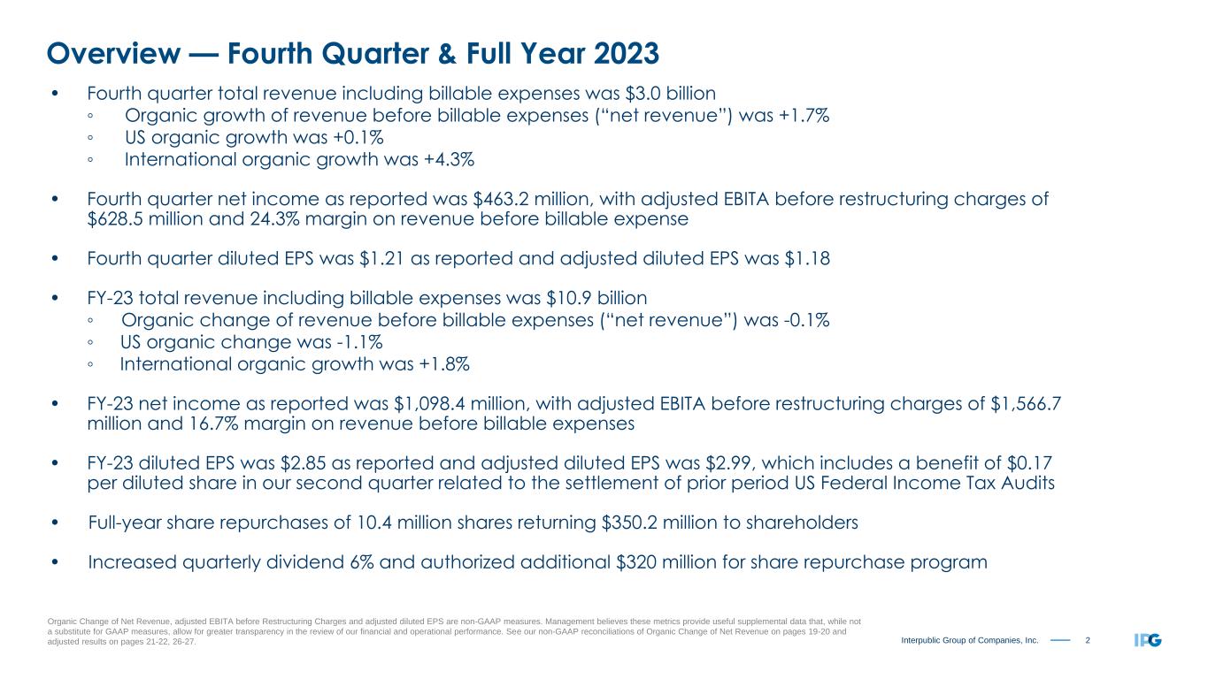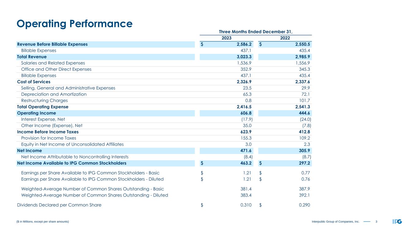 2Interpublic Group of Companies, Inc. Overview — Fourth Quarter & Full Year 2023 Organic Change of Net Revenue, adjusted EBITA before Restructuring Charges and adjusted diluted EPS are non-GAAP measures. Management believes these metrics provide useful supplemental data that, while not a substitute for GAAP measures, allow for greater transparency in the review of our financial and operational performance. See our non-GAAP reconciliations of Organic Change of Net Revenue on pages 19-20 and adjusted results on pages 21-22, 26-27. • Fourth quarter total revenue including billable expenses was $3.0 billion ◦ Organic growth of revenue before billable expenses (“net revenue”) was +1.7% ◦ US organic growth was +0.1% ◦ International organic growth was +4.3% • Fourth quarter net income as reported was $463.2 million, with adjusted EBITA before restructuring charges of $628.5 million and 24.3% margin on revenue before billable expense • Fourth quarter diluted EPS was $1.21 as reported and adjusted diluted EPS was $1.18 • FY-23 total revenue including billable expenses was $10.9 billion ◦ Organic change of revenue before billable expenses (“net revenue”) was -0.1% ◦ US organic change was -1.1% ◦ International organic growth was +1.8% • FY-23 net income as reported was $1,098.4 million, with adjusted EBITA before restructuring charges of $1,566.7 million and 16.7% margin on revenue before billable expenses • FY-23 diluted EPS was $2.85 as reported and adjusted diluted EPS was $2.99, which includes a benefit of $0.17 per diluted share in our second quarter related to the settlement of prior period US Federal Income Tax Audits • Full-year share repurchases of 10.4 million shares returning $350.2 million to shareholders • Increased quarterly dividend 6% and authorized additional $320 million for share repurchase program