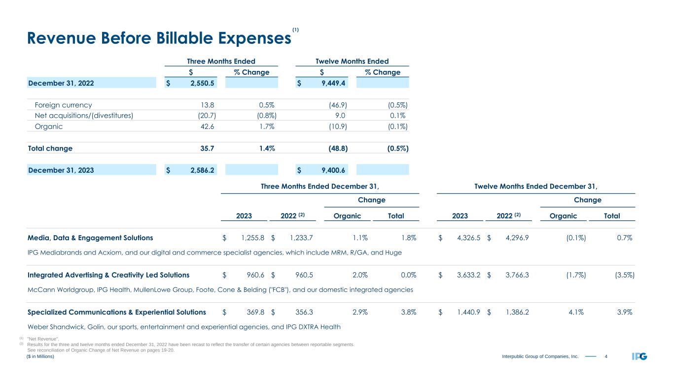 3Interpublic Group of Companies, Inc. Three Months Ended December 31, 2023 2022 Revenue Before Billable Expenses $ 2,586.2 $ 2,550.5 Billable Expenses 437.1 435.4 Total Revenue 3,023.3 2,985.9 Salaries and Related Expenses 1,536.9 1,556.9 Office and Other Direct Expenses 352.9 345.3 Billable Expenses 437.1 435.4 Cost of Services 2,326.9 2,337.6 Selling, General and Administrative Expenses 23.5 29.9 Depreciation and Amortization 65.3 72.1 Restructuring Charges 0.8 101.7 Total Operating Expense 2,416.5 2,541.3 Operating Income 606.8 444.6 Interest Expense, Net (17.9) (24.0) Other Income (Expense), Net 35.0 (7.8) Income Before Income Taxes 623.9 412.8 Provision for Income Taxes 155.3 109.2 Equity in Net Income of Unconsolidated Affiliates 3.0 2.3 Net Income 471.6 305.9 Net Income Attributable to Noncontrolling Interests (8.4) (8.7) Net Income Available to IPG Common Stockholders $ 463.2 $ 297.2 Earnings per Share Available to IPG Common Stockholders - Basic $ 1.21 $ 0.77 Earnings per Share Available to IPG Common Stockholders - Diluted $ 1.21 $ 0.76 Weighted-Average Number of Common Shares Outstanding - Basic 381.4 387.9 Weighted-Average Number of Common Shares Outstanding - Diluted 383.4 392.1 Dividends Declared per Common Share $ 0.310 $ 0.290 ($ in Millions, except per share amounts) Operating Performance