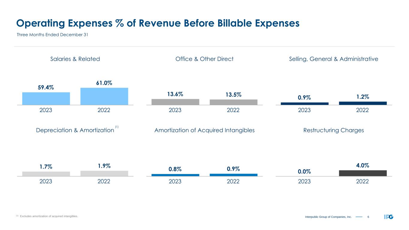 5Interpublic Group of Companies, Inc. Organic Change of Net Revenue by Region “All Other Markets” includes Canada, Africa and the Middle East. Circle proportions represent consolidated Net Revenue distribution. See reconciliation of Organic Change of Net Revenue, including total Net Revenue change, on page 19. Three Months Ended December 31, 2023 +0.1% United States +0.4% United Kingdom +11.7% Continental Europe +15.0% Latin America -1.5% Asia Pacific +4.3% International +1.7% Worldwide -1.4% All Other Markets