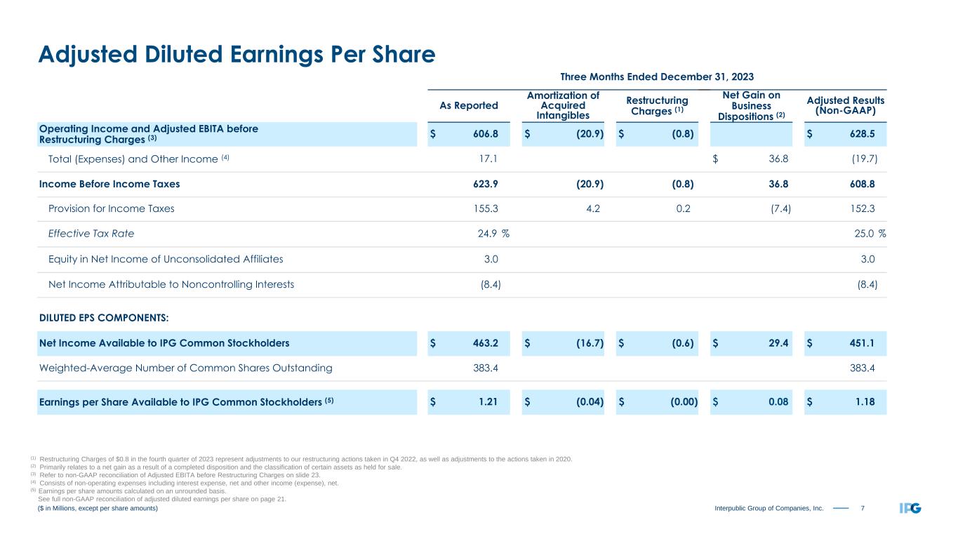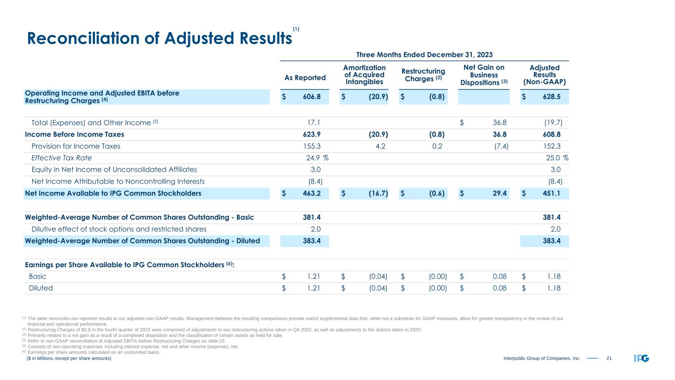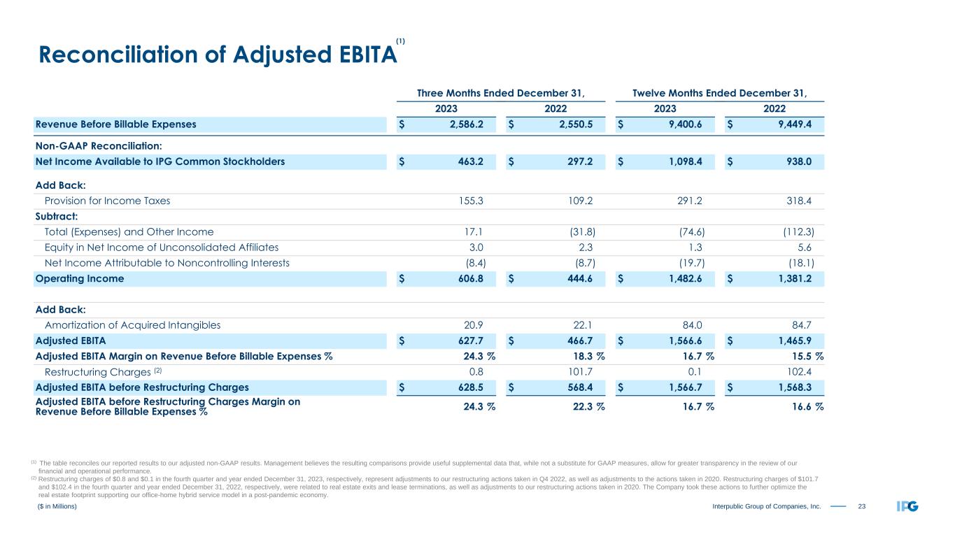 22Interpublic Group of Companies, Inc. Twelve Months Ended December 31, 2023 As Reported Amortization of Acquired Intangibles Restructuring Charges (2) Net Gain on Business Dispositions (3) Adjusted Results (Non-GAAP) Operating Income and Adjusted EBITA before Restructuring Charges (4) $ 1,482.6 $ (84.0) $ (0.1) $ 1,566.7 Total (Expenses) and Other Income (5) (74.6) $ 16.4 (91.0) Income Before Income Taxes 1,408.0 (84.0) (0.1) 16.4 1,475.7 Provision for Income Taxes 291.2 16.9 (0.1) (3.4) 304.6 Effective Tax Rate 20.7 % 20.6 % Equity in Net Income of Unconsolidated Affiliates 1.3 1.3 Net Income Attributable to Noncontrolling Interests (19.7) (19.7) Net Income Available to IPG Common Stockholders $ 1,098.4 $ (67.1) $ (0.2) $ 13.0 $ 1,152.7 Weighted-Average Number of Common Shares Outstanding - Basic 384.1 384.1 Dilutive effect of stock options and restricted shares 1.8 1.8 Weighted-Average Number of Common Shares Outstanding - Diluted 385.9 385.9 Earnings per Share Available to IPG Common Stockholders (6) (7): Basic $ 2.86 $ (0.17) $ (0.00) $ 0.03 $ 3.00 Diluted $ 2.85 $ (0.17) $ (0.00) $ 0.03 $ 2.99 ($ in Millions, except per share amounts) Reconciliation of Adjusted Results (1) The table reconciles our reported results to our adjusted non-GAAP results. Management believes the resulting comparisons provide useful supplemental data that, while not a substitute for GAAP measures, allow for greater transparency in the review of our financial and operational performance. (2) Restructuring Charges of $0.1 in FY 2023 were comprised of adjustments to our restructuring actions taken in Q4 2022, as well as adjustments to the actions taken in 2020. (3) Primarily relates to a net gain as a result of a completed disposition and the classification of certain assets as held for sale, as well as a loss related to the sale of an equity investment. (4) Refer to non-GAAP reconciliation of Adjusted EBITA before Restructuring Charges on slide 23. (5) Consists of non-operating expenses including interest expense, net and other income (expense), net. (6) Earnings per share amounts calculated on an unrounded basis. (7) Basic and diluted earnings per share, both As Reported and Adjusted Results (Non-GAAP), include a positive impact of $0.17 related to the settlement of U.S. Federal Income Tax Audits for the years 2017-2018. (1)