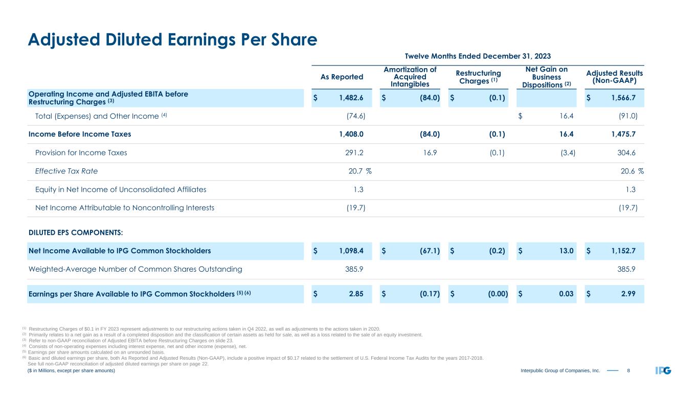 7Interpublic Group of Companies, Inc. Three Months Ended December 31, 2023 As Reported Amortization of Acquired Intangibles Restructuring Charges (1) Net Gain on Business Dispositions (2) Adjusted Results (Non-GAAP) Operating Income and Adjusted EBITA before Restructuring Charges (3) $ 606.8 $ (20.9) $ (0.8) $ 628.5 Total (Expenses) and Other Income (4) 17.1 $ 36.8 (19.7) Income Before Income Taxes 623.9 (20.9) (0.8) 36.8 608.8 Provision for Income Taxes 155.3 4.2 0.2 (7.4) 152.3 Effective Tax Rate 24.9 % 25.0 % Equity in Net Income of Unconsolidated Affiliates 3.0 3.0 Net Income Attributable to Noncontrolling Interests (8.4) (8.4) DILUTED EPS COMPONENTS: Net Income Available to IPG Common Stockholders $ 463.2 $ (16.7) $ (0.6) $ 29.4 $ 451.1 Weighted-Average Number of Common Shares Outstanding 383.4 383.4 Earnings per Share Available to IPG Common Stockholders (5) $ 1.21 $ (0.04) $ (0.00) $ 0.08 $ 1.18 ($ in Millions, except per share amounts) (1) Restructuring Charges of $0.8 in the fourth quarter of 2023 represent adjustments to our restructuring actions taken in Q4 2022, as well as adjustments to the actions taken in 2020. (2) Primarily relates to a net gain as a result of a completed disposition and the classification of certain assets as held for sale. (3) Refer to non-GAAP reconciliation of Adjusted EBITA before Restructuring Charges on slide 23. (4) Consists of non-operating expenses including interest expense, net and other income (expense), net. (5) Earnings per share amounts calculated on an unrounded basis. See full non-GAAP reconciliation of adjusted diluted earnings per share on page 21. Adjusted Diluted Earnings Per Share