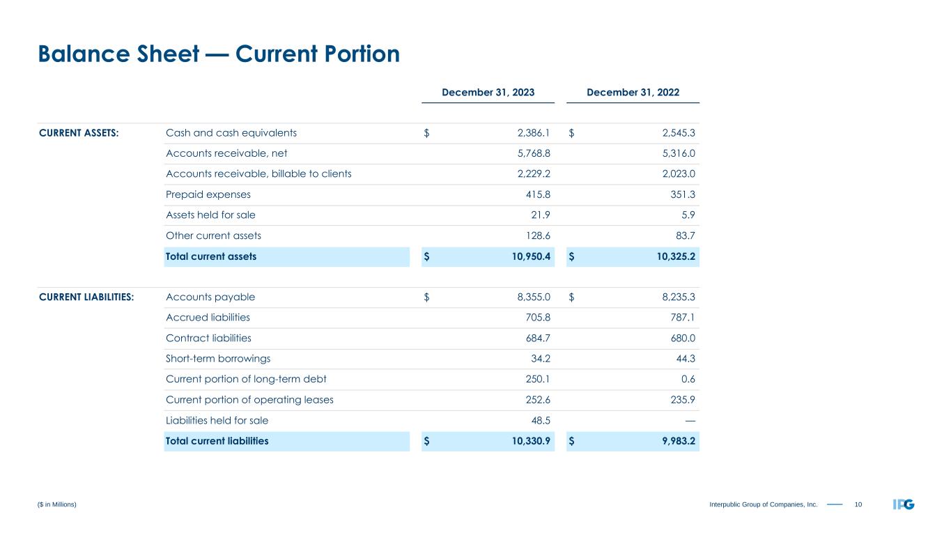 9Interpublic Group of Companies, Inc. Twelve Months Ended December 31, 2023 2022 Net income $ 1,118.1 $ 956.1 OPERATING ACTIVITIES: Depreciation & amortization 313.0 327.0 Other non-cash items 34.0 4.5 Deferred taxes 5.1 (27.0) Non-cash restructuring charges (0.9) 101.8 Net (gains) losses on sales of businesses (17.9) 11.3 Change in working capital, net (676.1) (672.3) Change in other non-current assets & liabilities (220.6) (59.3) Net cash provided by operating activities 554.7 642.1 INVESTING ACTIVITIES: Capital expenditures (179.3) (178.1) Purchase of short-term marketable securities (97.6) (0.2) Acquisitions, net of cash acquired (6.3) (232.2) Deconsolidation of a subsidiary — (20.4) Net proceeds from investments 35.1 2.6 Proceeds from sale of businesses, net of cash sold 58.7 (22.4) Maturity of short-term marketable securities 100.7 — Other investing activities 3.3 20.6 Net cash used in investing activities (85.4) (430.1) FINANCING ACTIVITIES: Common stock dividends (479.1) (457.3) Repurchases of common stock (350.2) (320.1) Tax payments for employee shares withheld (58.9) (40.3) Distributions to noncontrolling interests (17.7) (12.3) Acquisition-related payments (12.9) (9.3) Net decrease in short-term borrowings (8.2) (29.4) Repayments of long-term debt (0.5) (0.7) Settlement of senior note — (29.9) Proceeds from long-term debt 296.3 — Other financing activities (3.1) (0.1) Net cash used in financing activities (634.3) (899.4) Currency effect 7.0 (31.7) Net decrease in cash, cash equivalents and restricted cash $ (158.0) $ (719.1) ($ in Millions) Cash Flow