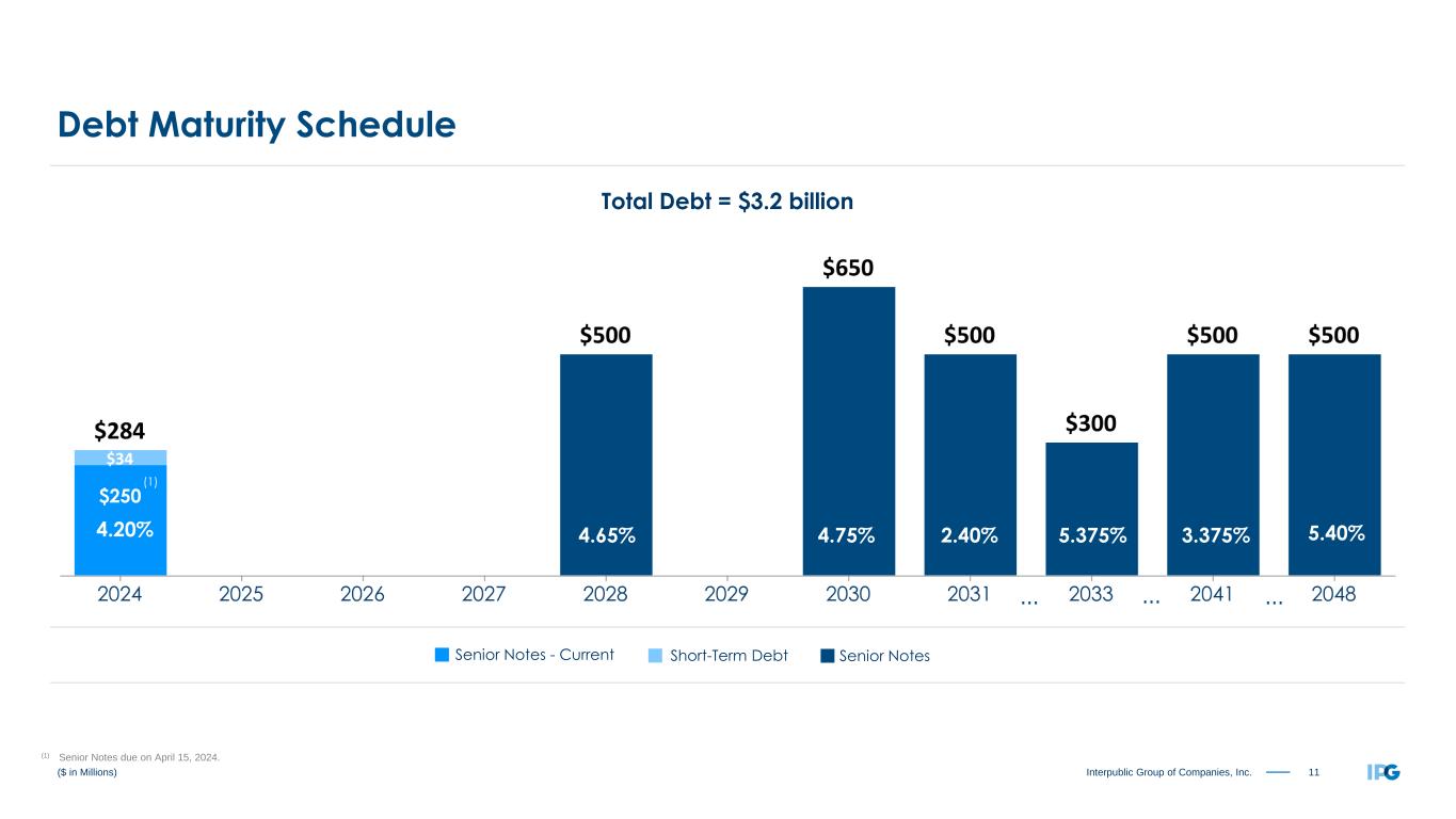 11Interpublic Group of Companies, Inc. 4.65% 5.40%4.20% Total Debt = $3.2 billion ($ in Millions) Debt Maturity Schedule 4.75% 2.40% 3.375% ... ... Short-Term Debt Senior NotesSenior Notes - Current (1) Senior Notes due on April 15, 2024. (1) 5.375% ... $250