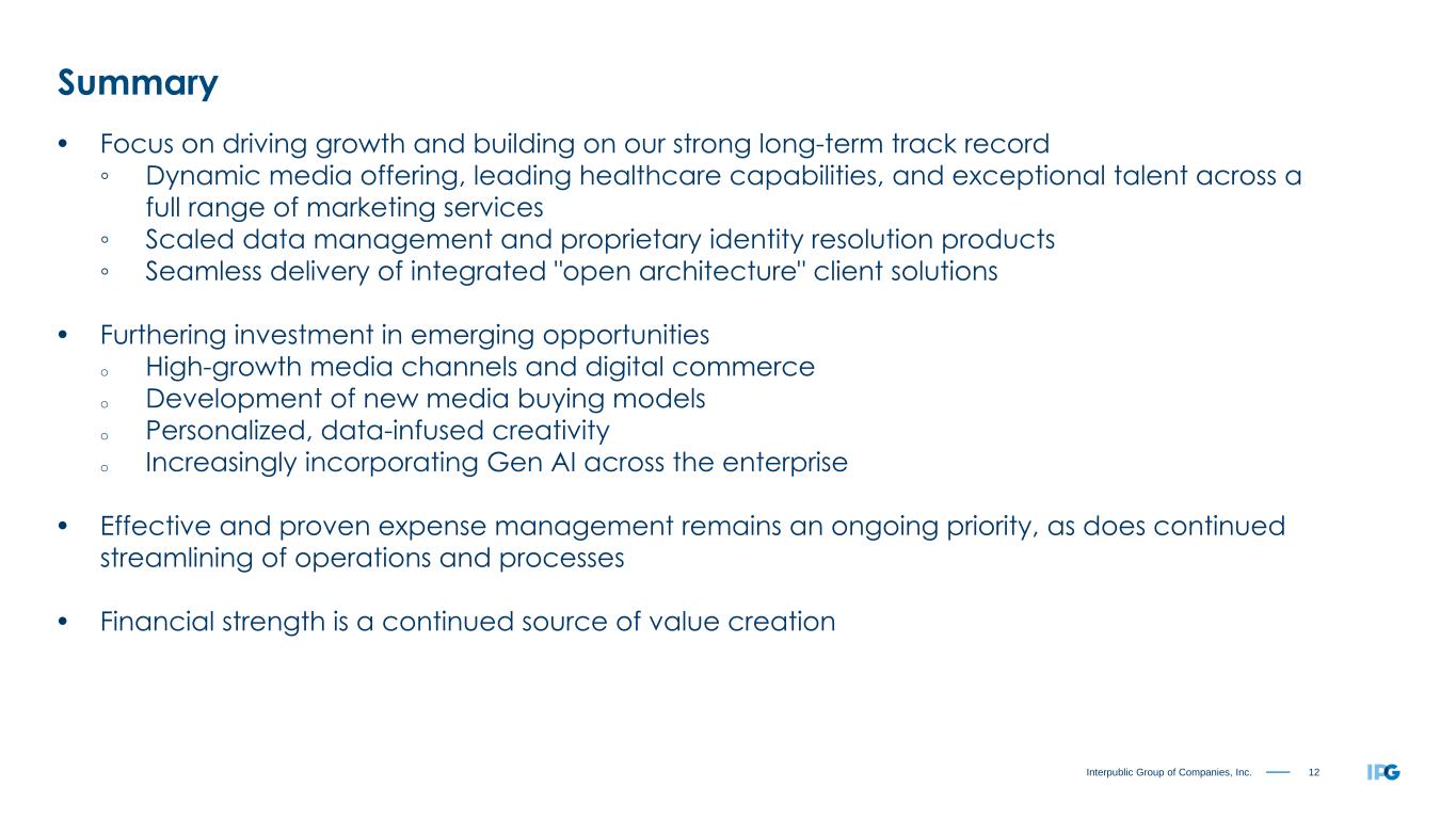 12Interpublic Group of Companies, Inc. Summary • Focus on driving growth and building on our strong long-term track record ◦ Dynamic media offering, leading healthcare capabilities, and exceptional talent across a full range of marketing services ◦ Scaled data management and proprietary identity resolution products ◦ Seamless delivery of integrated "open architecture" client solutions • Furthering investment in emerging opportunities o High-growth media channels and digital commerce o Development of new media buying models o Personalized, data-infused creativity o Increasingly incorporating Gen AI across the enterprise • Effective and proven expense management remains an ongoing priority, as does continued streamlining of operations and processes • Financial strength is a continued source of value creation