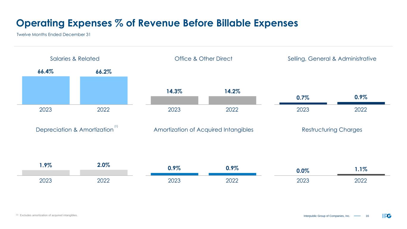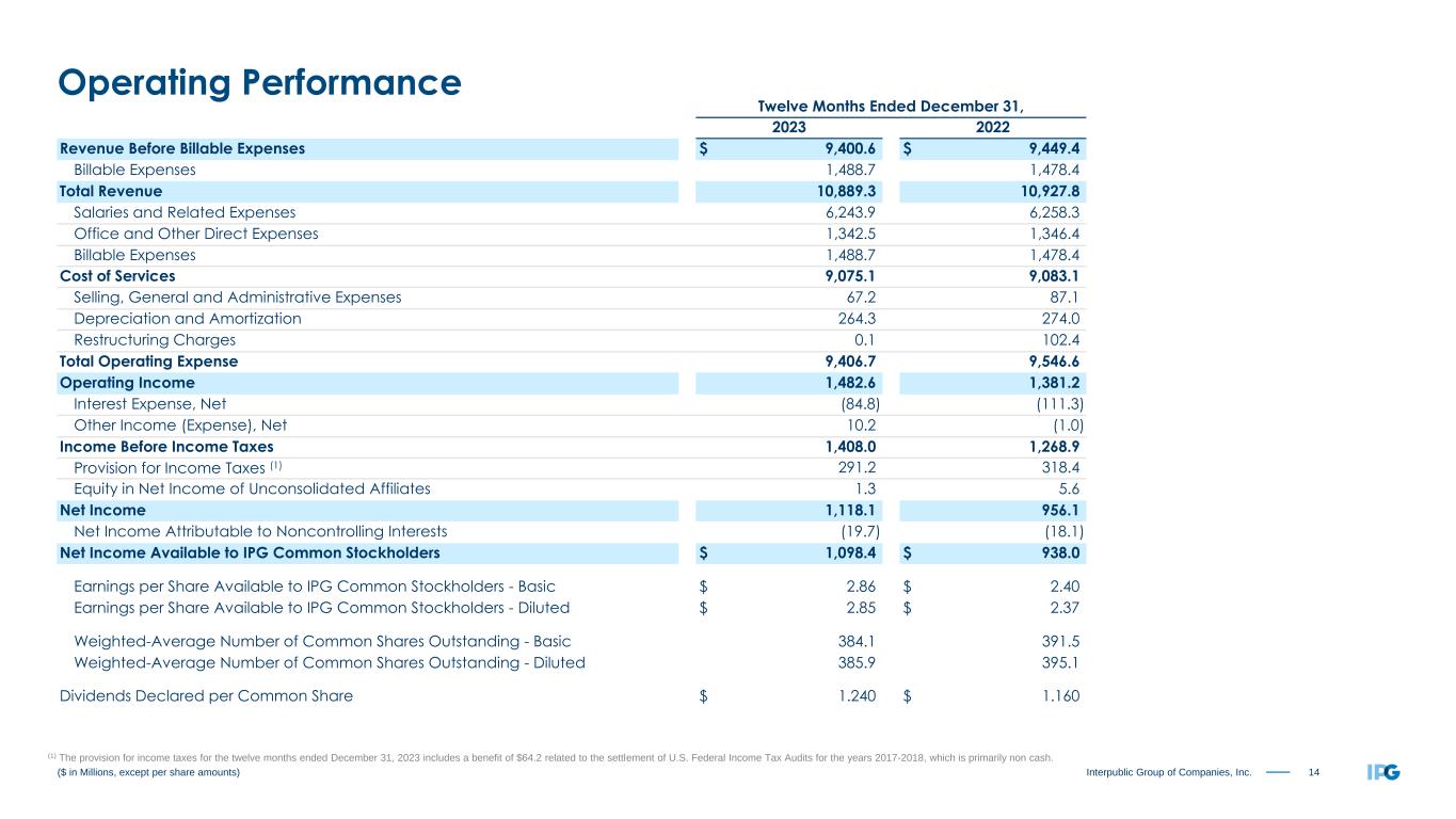 14Interpublic Group of Companies, Inc. Twelve Months Ended December 31, 2023 2022 Revenue Before Billable Expenses $ 9,400.6 $ 9,449.4 Billable Expenses 1,488.7 1,478.4 Total Revenue 10,889.3 10,927.8 Salaries and Related Expenses 6,243.9 6,258.3 Office and Other Direct Expenses 1,342.5 1,346.4 Billable Expenses 1,488.7 1,478.4 Cost of Services 9,075.1 9,083.1 Selling, General and Administrative Expenses 67.2 87.1 Depreciation and Amortization 264.3 274.0 Restructuring Charges 0.1 102.4 Total Operating Expense 9,406.7 9,546.6 Operating Income 1,482.6 1,381.2 Interest Expense, Net (84.8) (111.3) Other Income (Expense), Net 10.2 (1.0) Income Before Income Taxes 1,408.0 1,268.9 Provision for Income Taxes (1) 291.2 318.4 Equity in Net Income of Unconsolidated Affiliates 1.3 5.6 Net Income 1,118.1 956.1 Net Income Attributable to Noncontrolling Interests (19.7) (18.1) Net Income Available to IPG Common Stockholders $ 1,098.4 $ 938.0 Earnings per Share Available to IPG Common Stockholders - Basic $ 2.86 $ 2.40 Earnings per Share Available to IPG Common Stockholders - Diluted $ 2.85 $ 2.37 Weighted-Average Number of Common Shares Outstanding - Basic 384.1 391.5 Weighted-Average Number of Common Shares Outstanding - Diluted 385.9 395.1 Dividends Declared per Common Share $ 1.240 $ 1.160 ($ in Millions, except per share amounts) Operating Performance (1) The provision for income taxes for the twelve months ended December 31, 2023 includes a benefit of $64.2 related to the settlement of U.S. Federal Income Tax Audits for the years 2017-2018, which is primarily non cash.