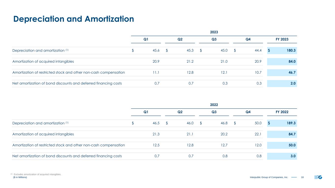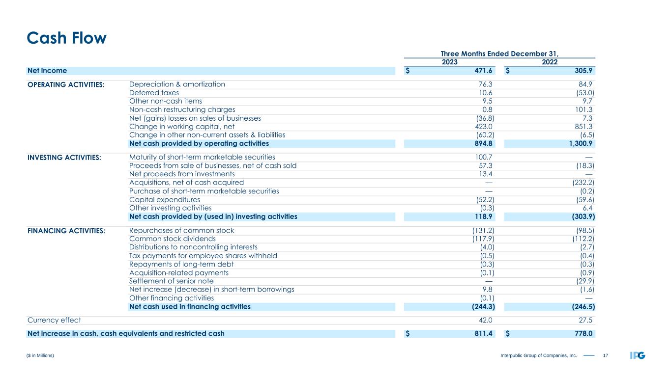 17Interpublic Group of Companies, Inc. Three Months Ended December 31, 2023 2022 Net income $ 471.6 $ 305.9 OPERATING ACTIVITIES: Depreciation & amortization 76.3 84.9 Deferred taxes 10.6 (53.0) Other non-cash items 9.5 9.7 Non-cash restructuring charges 0.8 101.3 Net (gains) losses on sales of businesses (36.8) 7.3 Change in working capital, net 423.0 851.3 Change in other non-current assets & liabilities (60.2) (6.5) Net cash provided by operating activities 894.8 1,300.9 INVESTING ACTIVITIES: Maturity of short-term marketable securities 100.7 — Proceeds from sale of businesses, net of cash sold 57.3 (18.3) Net proceeds from investments 13.4 — Acquisitions, net of cash acquired — (232.2) Purchase of short-term marketable securities — (0.2) Capital expenditures (52.2) (59.6) Other investing activities (0.3) 6.4 Net cash provided by (used in) investing activities 118.9 (303.9) FINANCING ACTIVITIES: Repurchases of common stock (131.2) (98.5) Common stock dividends (117.9) (112.2) Distributions to noncontrolling interests (4.0) (2.7) Tax payments for employee shares withheld (0.5) (0.4) Repayments of long-term debt (0.3) (0.3) Acquisition-related payments (0.1) (0.9) Settlement of senior note — (29.9) Net increase (decrease) in short-term borrowings 9.8 (1.6) Other financing activities (0.1) — Net cash used in financing activities (244.3) (246.5) Currency effect 42.0 27.5 Net increase in cash, cash equivalents and restricted cash $ 811.4 $ 778.0 ($ in Millions) Cash Flow