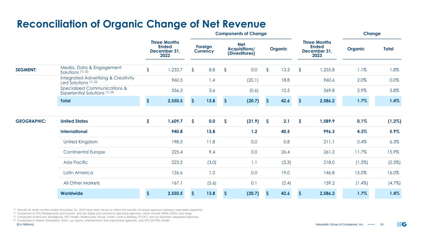20Interpublic Group of Companies, Inc. ($ in Millions) Reconciliation of Organic Change of Net Revenue Components of Change Change Twelve Months Ended December 31, 2022 Foreign Currency Net Acquisitions/ (Divestitures) Organic Twelve Months Ended December 31, 2023 Organic Total SEGMENT: Media, Data & Engagement Solutions (1) (2) $ 4,296.9 $ (19.9) $ 54.0 $ (4.5) $ 4,326.5 (0.1%) 0.7% Integrated Advertising & Creativity Led Solutions (1) (3) 3,766.3 (25.1) (44.4) (63.6) 3,633.2 (1.7%) (3.5%) Specialized Communications & Experiential Solutions (1) (4) 1,386.2 (1.9) (0.6) 57.2 1,440.9 4.1% 3.9% Total $ 9,449.4 $ (46.9) $ 9.0 $ (10.9) $ 9,400.6 (0.1%) (0.5%) GEOGRAPHIC: United States $ 6,157.7 $ 0.0 $ 13.2 $ (68.7) $ 6,102.2 (1.1%) (0.9%) International 3,291.7 (46.9) (4.2) 57.8 3,298.4 1.8% 0.2% United Kingdom 742.2 4.0 0.0 13.0 759.2 1.8% 2.3% Continental Europe 764.6 14.1 0.0 17.0 795.7 2.2% 4.1% Asia Pacific 772.7 (27.0) 5.3 (21.2) 729.8 (2.7%) (5.6%) Latin America 423.6 (8.4) (1.4) 34.9 448.7 8.2% 5.9% All Other Markets 588.6 (29.6) (8.1) 14.1 565.0 2.4% (4.0%) Worldwide $ 9,449.4 $ (46.9) $ 9.0 $ (10.9) $ 9,400.6 (0.1%) (0.5%) (1) Results for twelve months ended December 31, 2022 have been recast to reflect the transfer of certain agencies between reportable segments. (2) Comprised of IPG Mediabrands and Acxiom, and our digital and commerce specialist agencies, which include MRM, R/GA, and Huge. (3) Comprised of McCann Worldgroup, IPG Health, MullenLowe Group, Foote, Cone & Belding ("FCB"), and our domestic integrated agencies. (4) Comprised of Weber Shandwick, Golin, our sports, entertainment and experiential agencies, and IPG DXTRA Health.