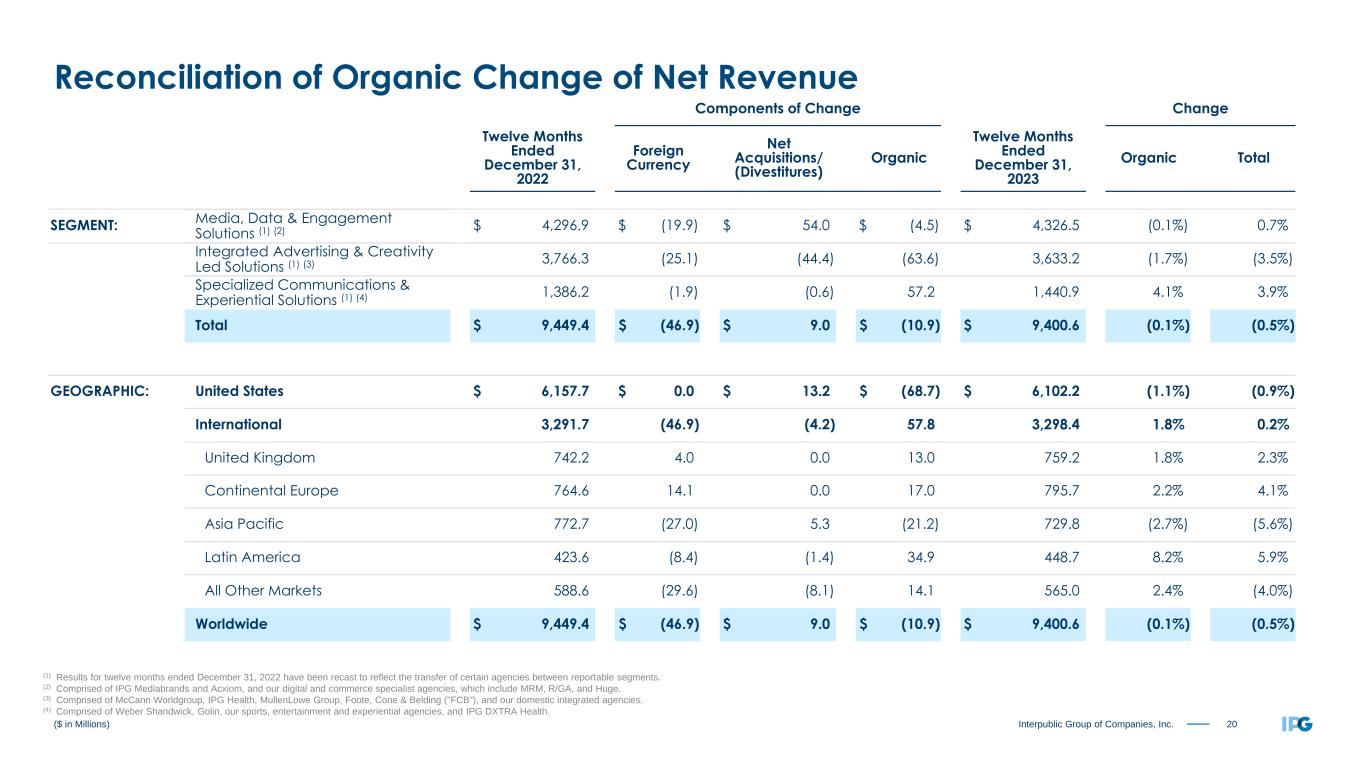 19Interpublic Group of Companies, Inc. Components of Change Change Three Months Ended December 31, 2022 Foreign Currency Net Acquisitions/ (Divestitures) Organic Three Months Ended December 31, 2023 Organic Total SEGMENT: Media, Data & Engagement Solutions (1) (2) $ 1,233.7 $ 8.8 $ 0.0 $ 13.3 $ 1,255.8 1.1% 1.8% Integrated Advertising & Creativity Led Solutions (1) (3) 960.5 1.4 (20.1) 18.8 960.6 2.0% 0.0% Specialized Communications & Experiential Solutions (1) (4) 356.3 3.6 (0.6) 10.5 369.8 2.9% 3.8% Total $ 2,550.5 $ 13.8 $ (20.7) $ 42.6 $ 2,586.2 1.7% 1.4% GEOGRAPHIC: United States $ 1,609.7 $ 0.0 $ (21.9) $ 2.1 $ 1,589.9 0.1% (1.2%) International 940.8 13.8 1.2 40.5 996.3 4.3% 5.9% United Kingdom 198.5 11.8 0.0 0.8 211.1 0.4% 6.3% Continental Europe 225.4 9.4 0.0 26.4 261.2 11.7% 15.9% Asia Pacific 223.2 (3.0) 1.1 (3.3) 218.0 (1.5%) (2.3%) Latin America 126.6 1.2 0.0 19.0 146.8 15.0% 16.0% All Other Markets 167.1 (5.6) 0.1 (2.4) 159.2 (1.4%) (4.7%) Worldwide $ 2,550.5 $ 13.8 $ (20.7) $ 42.6 $ 2,586.2 1.7% 1.4% ($ in Millions) Reconciliation of Organic Change of Net Revenue (1) Results for three months ended December 31, 2022 have been recast to reflect the transfer of certain agencies between reportable segments. (2) Comprised of IPG Mediabrands and Acxiom, and our digital and commerce specialist agencies, which include MRM, R/GA, and Huge. (3) Comprised of McCann Worldgroup, IPG Health, MullenLowe Group, Foote, Cone & Belding ("FCB"), and our domestic integrated agencies. (4) Comprised of Weber Shandwick, Golin, our sports, entertainment and experiential agencies, and IPG DXTRA Health.