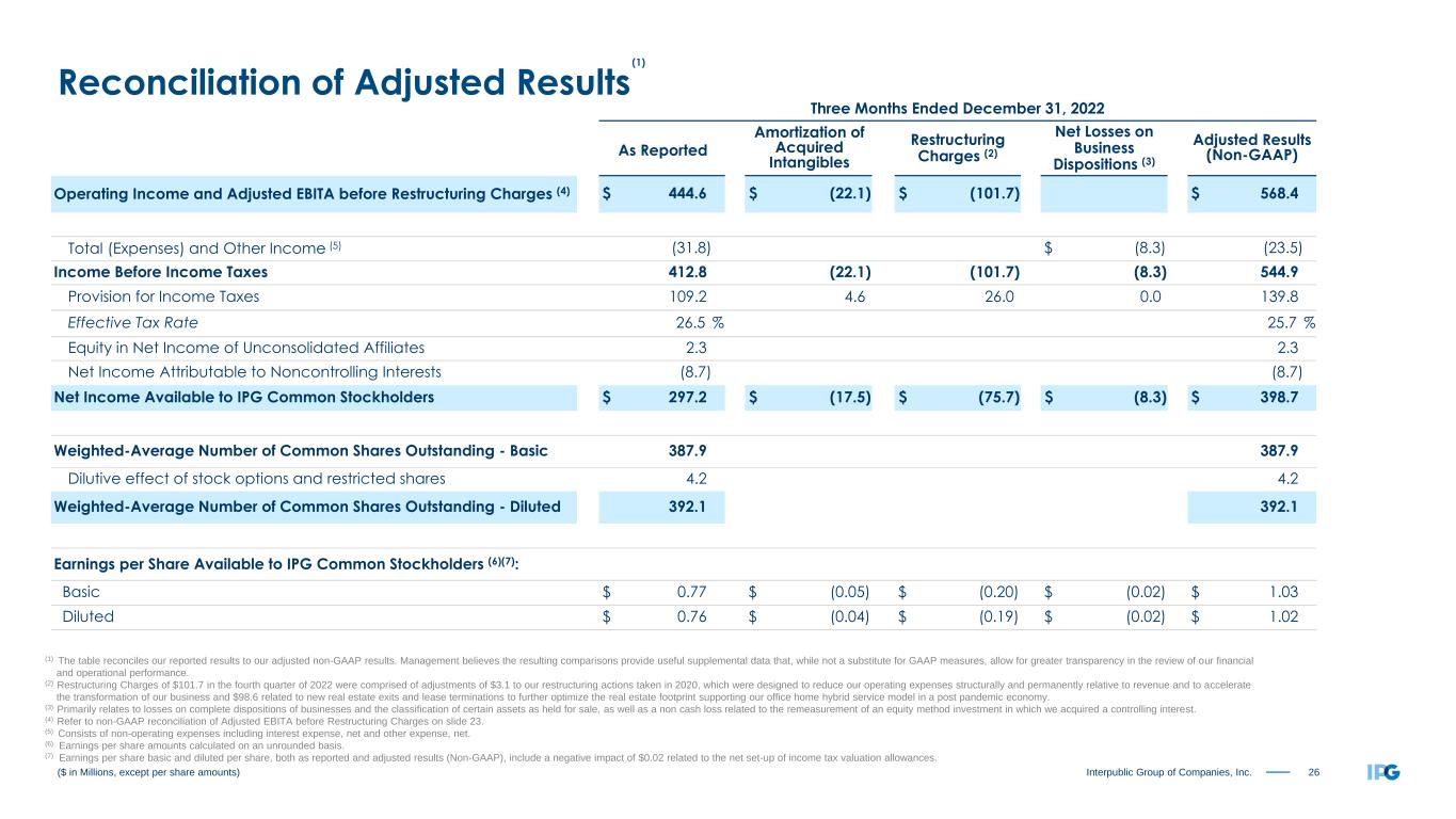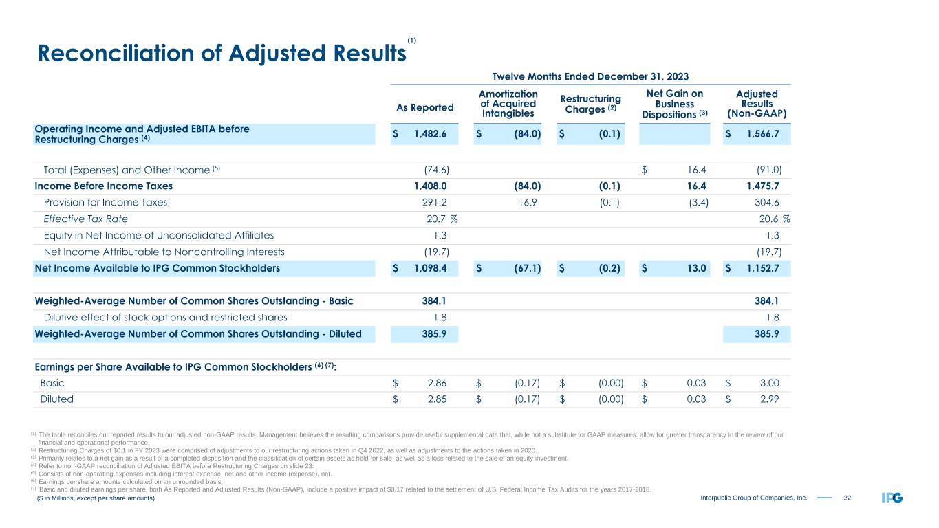 21Interpublic Group of Companies, Inc. Three Months Ended December 31, 2023 As Reported Amortization of Acquired Intangibles Restructuring Charges (2) Net Gain on Business Dispositions (3) Adjusted Results (Non-GAAP) Operating Income and Adjusted EBITA before Restructuring Charges (4) $ 606.8 $ (20.9) $ (0.8) $ 628.5 Total (Expenses) and Other Income (5) 17.1 $ 36.8 (19.7) Income Before Income Taxes 623.9 (20.9) (0.8) 36.8 608.8 Provision for Income Taxes 155.3 4.2 0.2 (7.4) 152.3 Effective Tax Rate 24.9 % 25.0 % Equity in Net Income of Unconsolidated Affiliates 3.0 3.0 Net Income Attributable to Noncontrolling Interests (8.4) (8.4) Net Income Available to IPG Common Stockholders $ 463.2 $ (16.7) $ (0.6) $ 29.4 $ 451.1 Weighted-Average Number of Common Shares Outstanding - Basic 381.4 381.4 Dilutive effect of stock options and restricted shares 2.0 2.0 Weighted-Average Number of Common Shares Outstanding - Diluted 383.4 383.4 Earnings per Share Available to IPG Common Stockholders (6): Basic $ 1.21 $ (0.04) $ (0.00) $ 0.08 $ 1.18 Diluted $ 1.21 $ (0.04) $ (0.00) $ 0.08 $ 1.18 ($ in Millions, except per share amounts) (1) The table reconciles our reported results to our adjusted non-GAAP results. Management believes the resulting comparisons provide useful supplemental data that, while not a substitute for GAAP measures, allow for greater transparency in the review of our financial and operational performance. (2) Restructuring Charges of $0.8 in the fourth quarter of 2023 were comprised of adjustments to our restructuring actions taken in Q4 2022, as well as adjustments to the actions taken in 2020. (3) Primarily relates to a net gain as a result of a completed disposition and the classification of certain assets as held for sale. (4) Refer to non-GAAP reconciliation of Adjusted EBITA before Restructuring Charges on slide 23. (5) Consists of non-operating expenses including interest expense, net and other income (expense), net. (6) Earnings per share amounts calculated on an unrounded basis. Reconciliation of Adjusted Results (1)