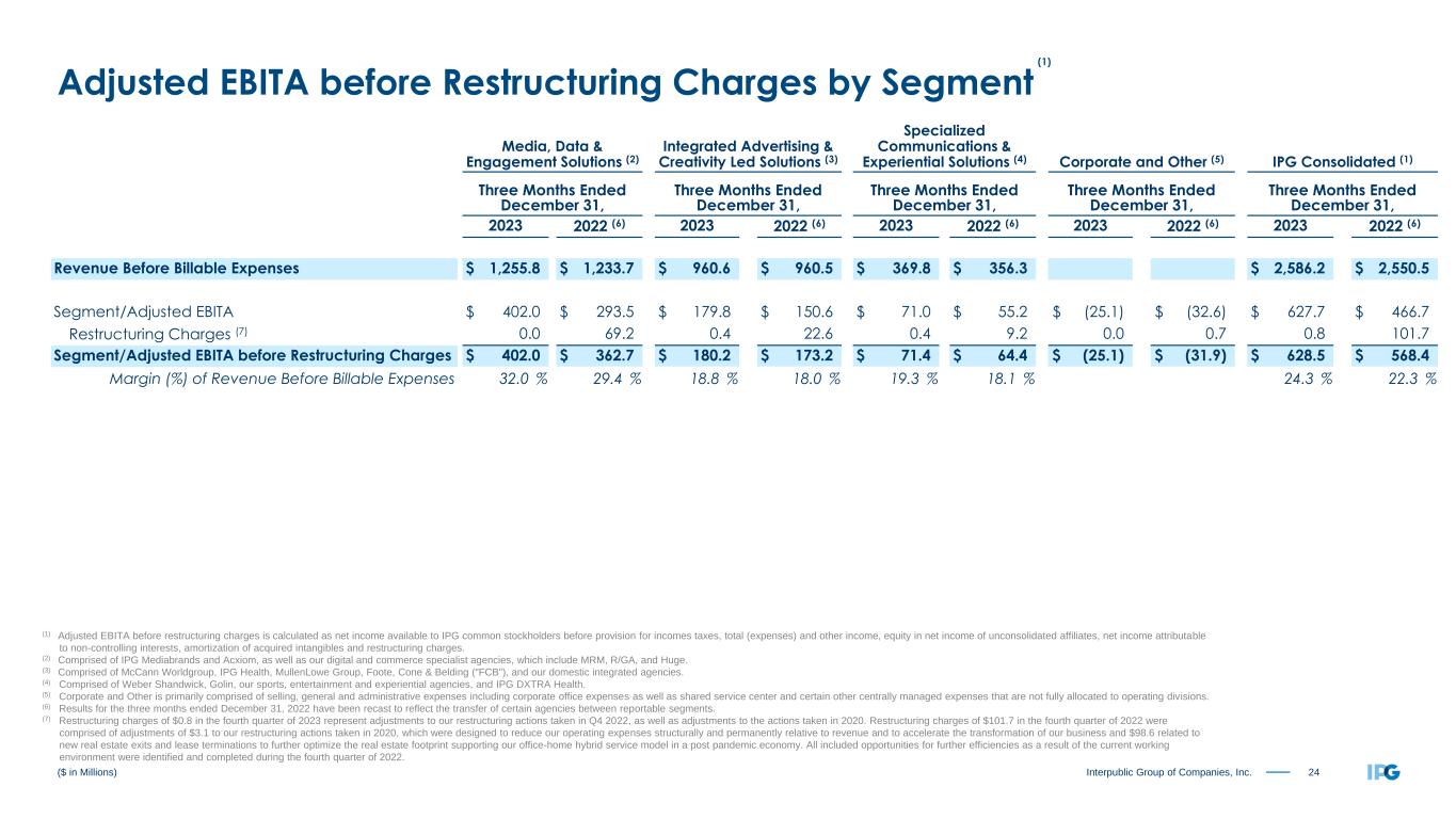 23Interpublic Group of Companies, Inc. Reconciliation of Adjusted EBITA Three Months Ended December 31, Twelve Months Ended December 31, 2023 2022 2023 2022 Revenue Before Billable Expenses $ 2,586.2 $ 2,550.5 $ 9,400.6 $ 9,449.4 Non-GAAP Reconciliation: Net Income Available to IPG Common Stockholders $ 463.2 $ 297.2 $ 1,098.4 $ 938.0 Add Back: Provision for Income Taxes 155.3 109.2 291.2 318.4 Subtract: Total (Expenses) and Other Income 17.1 (31.8) (74.6) (112.3) Equity in Net Income of Unconsolidated Affiliates 3.0 2.3 1.3 5.6 Net Income Attributable to Noncontrolling Interests (8.4) (8.7) (19.7) (18.1) Operating Income $ 606.8 $ 444.6 $ 1,482.6 $ 1,381.2 Add Back: Amortization of Acquired Intangibles 20.9 22.1 84.0 84.7 Adjusted EBITA $ 627.7 $ 466.7 $ 1,566.6 $ 1,465.9 Adjusted EBITA Margin on Revenue Before Billable Expenses % 24.3 % 18.3 % 16.7 % 15.5 % Restructuring Charges (2) 0.8 101.7 0.1 102.4 Adjusted EBITA before Restructuring Charges $ 628.5 $ 568.4 $ 1,566.7 $ 1,568.3 Adjusted EBITA before Restructuring Charges Margin on Revenue Before Billable Expenses % 24.3 % 22.3 % 16.7 % 16.6 % (1) ($ in Millions) (1) The table reconciles our reported results to our adjusted non-GAAP results. Management believes the resulting comparisons provide useful supplemental data that, while not a substitute for GAAP measures, allow for greater transparency in the review of our financial and operational performance. (2) Restructuring charges of $0.8 and $0.1 in the fourth quarter and year ended December 31, 2023, respectively, represent adjustments to our restructuring actions taken in Q4 2022, as well as adjustments to the actions taken in 2020. Restructuring charges of $101.7 and $102.4 in the fourth quarter and year ended December 31, 2022, respectively, were related to real estate exits and lease terminations, as well as adjustments to our restructuring actions taken in 2020. The Company took these actions to further optimize the real estate footprint supporting our office-home hybrid service model in a post-pandemic economy.