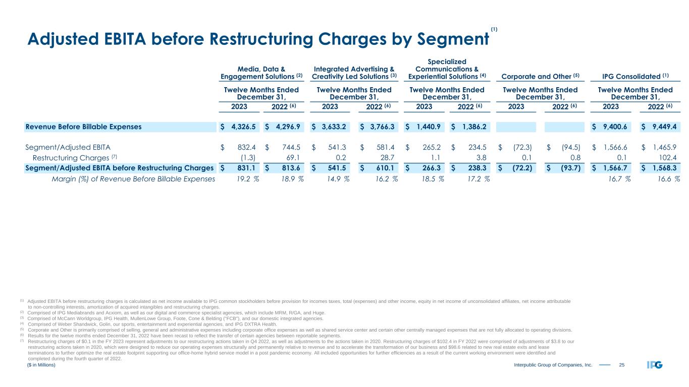 24Interpublic Group of Companies, Inc. ($ in Millions) (1) Adjusted EBITA before restructuring charges is calculated as net income available to IPG common stockholders before provision for incomes taxes, total (expenses) and other income, equity in net income of unconsolidated affiliates, net income attributable to non-controlling interests, amortization of acquired intangibles and restructuring charges. (2) Comprised of IPG Mediabrands and Acxiom, as well as our digital and commerce specialist agencies, which include MRM, R/GA, and Huge. (3) Comprised of McCann Worldgroup, IPG Health, MullenLowe Group, Foote, Cone & Belding ("FCB"), and our domestic integrated agencies. (4) Comprised of Weber Shandwick, Golin, our sports, entertainment and experiential agencies, and IPG DXTRA Health. (5) Corporate and Other is primarily comprised of selling, general and administrative expenses including corporate office expenses as well as shared service center and certain other centrally managed expenses that are not fully allocated to operating divisions. (6) Results for the three months ended December 31, 2022 have been recast to reflect the transfer of certain agencies between reportable segments. (7) Restructuring charges of $0.8 in the fourth quarter of 2023 represent adjustments to our restructuring actions taken in Q4 2022, as well as adjustments to the actions taken in 2020. Restructuring charges of $101.7 in the fourth quarter of 2022 were comprised of adjustments of $3.1 to our restructuring actions taken in 2020, which were designed to reduce our operating expenses structurally and permanently relative to revenue and to accelerate the transformation of our business and $98.6 related to new real estate exits and lease terminations to further optimize the real estate footprint supporting our office-home hybrid service model in a post pandemic economy. All included opportunities for further efficiencies as a result of the current working environment were identified and completed during the fourth quarter of 2022. Media, Data & Engagement Solutions (2) Integrated Advertising & Creativity Led Solutions (3) Specialized Communications & Experiential Solutions (4) Corporate and Other (5) IPG Consolidated (1) Three Months Ended December 31, Three Months Ended December 31, Three Months Ended December 31, Three Months Ended December 31, Three Months Ended December 31, 2023 2022 (6) 2023 2022 (6) 2023 2022 (6) 2023 2022 (6) 2023 2022 (6) Revenue Before Billable Expenses $ 1,255.8 $ 1,233.7 $ 960.6 $ 960.5 $ 369.8 $ 356.3 $ 2,586.2 $ 2,550.5 Segment/Adjusted EBITA $ 402.0 $ 293.5 $ 179.8 $ 150.6 $ 71.0 $ 55.2 $ (25.1) $ (32.6) $ 627.7 $ 466.7 Restructuring Charges (7) 0.0 69.2 0.4 22.6 0.4 9.2 0.0 0.7 0.8 101.7 Segment/Adjusted EBITA before Restructuring Charges $ 402.0 $ 362.7 $ 180.2 $ 173.2 $ 71.4 $ 64.4 $ (25.1) $ (31.9) $ 628.5 $ 568.4 Margin (%) of Revenue Before Billable Expenses 32.0 % 29.4 % 18.8 % 18.0 % 19.3 % 18.1 % 24.3 % 22.3 % Adjusted EBITA before Restructuring Charges by Segment (1)