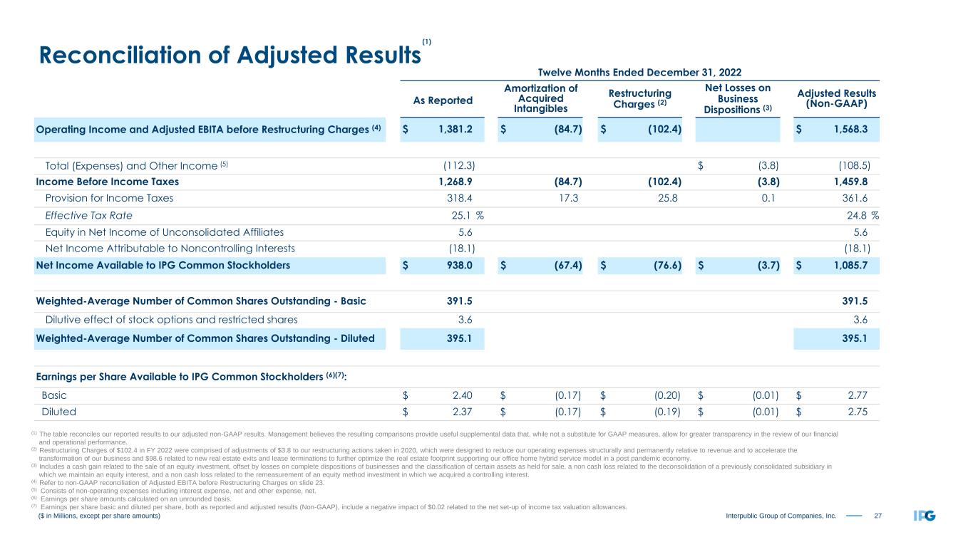 26Interpublic Group of Companies, Inc. ($ in Millions, except per share amounts) (1) The table reconciles our reported results to our adjusted non-GAAP results. Management believes the resulting comparisons provide useful supplemental data that, while not a substitute for GAAP measures, allow for greater transparency in the review of our financial and operational performance. (2) Restructuring Charges of $101.7 in the fourth quarter of 2022 were comprised of adjustments of $3.1 to our restructuring actions taken in 2020, which were designed to reduce our operating expenses structurally and permanently relative to revenue and to accelerate the transformation of our business and $98.6 related to new real estate exits and lease terminations to further optimize the real estate footprint supporting our office home hybrid service model in a post pandemic economy. (3) Primarily relates to losses on complete dispositions of businesses and the classification of certain assets as held for sale, as well as a non cash loss related to the remeasurement of an equity method investment in which we acquired a controlling interest. (4) Refer to non-GAAP reconciliation of Adjusted EBITA before Restructuring Charges on slide 23. (5) Consists of non-operating expenses including interest expense, net and other expense, net. (6) Earnings per share amounts calculated on an unrounded basis. (7) Earnings per share basic and diluted per share, both as reported and adjusted results (Non-GAAP), include a negative impact of $0.02 related to the net set-up of income tax valuation allowances. Reconciliation of Adjusted Results (1) Three Months Ended December 31, 2022 As Reported Amortization of Acquired Intangibles Restructuring Charges (2) Net Losses on Business Dispositions (3) Adjusted Results (Non-GAAP) Operating Income and Adjusted EBITA before Restructuring Charges (4) $ 444.6 $ (22.1) $ (101.7) $ 568.4 Total (Expenses) and Other Income (5) (31.8) $ (8.3) (23.5) Income Before Income Taxes 412.8 (22.1) (101.7) (8.3) 544.9 Provision for Income Taxes 109.2 4.6 26.0 0.0 139.8 Effective Tax Rate 26.5 % 25.7 % Equity in Net Income of Unconsolidated Affiliates 2.3 2.3 Net Income Attributable to Noncontrolling Interests (8.7) (8.7) Net Income Available to IPG Common Stockholders $ 297.2 $ (17.5) $ (75.7) $ (8.3) $ 398.7 Weighted-Average Number of Common Shares Outstanding - Basic 387.9 387.9 Dilutive effect of stock options and restricted shares 4.2 4.2 Weighted-Average Number of Common Shares Outstanding - Diluted 392.1 392.1 Earnings per Share Available to IPG Common Stockholders (6)(7): Basic $ 0.77 $ (0.05) $ (0.20) $ (0.02) $ 1.03 Diluted $ 0.76 $ (0.04) $ (0.19) $ (0.02) $ 1.02