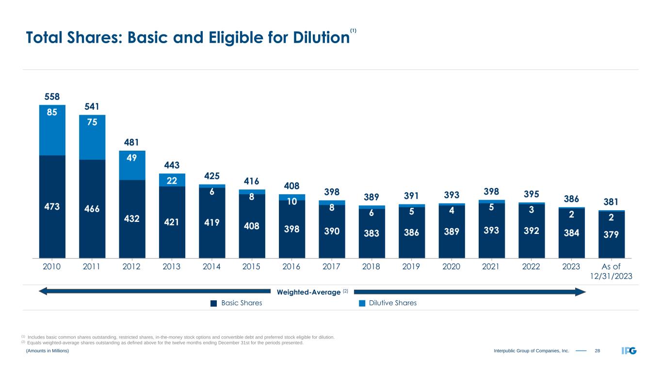 27Interpublic Group of Companies, Inc. Twelve Months Ended December 31, 2022 As Reported Amortization of Acquired Intangibles Restructuring Charges (2) Net Losses on Business Dispositions (3) Adjusted Results (Non-GAAP) Operating Income and Adjusted EBITA before Restructuring Charges (4) $ 1,381.2 $ (84.7) $ (102.4) $ 1,568.3 Total (Expenses) and Other Income (5) (112.3) $ (3.8) (108.5) Income Before Income Taxes 1,268.9 (84.7) (102.4) (3.8) 1,459.8 Provision for Income Taxes 318.4 17.3 25.8 0.1 361.6 Effective Tax Rate 25.1 % 24.8 % Equity in Net Income of Unconsolidated Affiliates 5.6 5.6 Net Income Attributable to Noncontrolling Interests (18.1) (18.1) Net Income Available to IPG Common Stockholders $ 938.0 $ (67.4) $ (76.6) $ (3.7) $ 1,085.7 Weighted-Average Number of Common Shares Outstanding - Basic 391.5 391.5 Dilutive effect of stock options and restricted shares 3.6 3.6 Weighted-Average Number of Common Shares Outstanding - Diluted 395.1 395.1 Earnings per Share Available to IPG Common Stockholders (6)(7): Basic $ 2.40 $ (0.17) $ (0.20) $ (0.01) $ 2.77 Diluted $ 2.37 $ (0.17) $ (0.19) $ (0.01) $ 2.75 ($ in Millions, except per share amounts) (1) The table reconciles our reported results to our adjusted non-GAAP results. Management believes the resulting comparisons provide useful supplemental data that, while not a substitute for GAAP measures, allow for greater transparency in the review of our financial and operational performance. (2) Restructuring Charges of $102.4 in FY 2022 were comprised of adjustments of $3.8 to our restructuring actions taken in 2020, which were designed to reduce our operating expenses structurally and permanently relative to revenue and to accelerate the transformation of our business and $98.6 related to new real estate exits and lease terminations to further optimize the real estate footprint supporting our office home hybrid service model in a post pandemic economy. (3) Includes a cash gain related to the sale of an equity investment, offset by losses on complete dispositions of businesses and the classification of certain assets as held for sale, a non cash loss related to the deconsolidation of a previously consolidated subsidiary in which we maintain an equity interest, and a non cash loss related to the remeasurement of an equity method investment in which we acquired a controlling interest. (4) Refer to non-GAAP reconciliation of Adjusted EBITA before Restructuring Charges on slide 23. (5) Consists of non-operating expenses including interest expense, net and other expense, net. (6) Earnings per share amounts calculated on an unrounded basis. (7) Earnings per share basic and diluted per share, both as reported and adjusted results (Non-GAAP), include a negative impact of $0.02 related to the net set-up of income tax valuation allowances. Reconciliation of Adjusted Results (1)