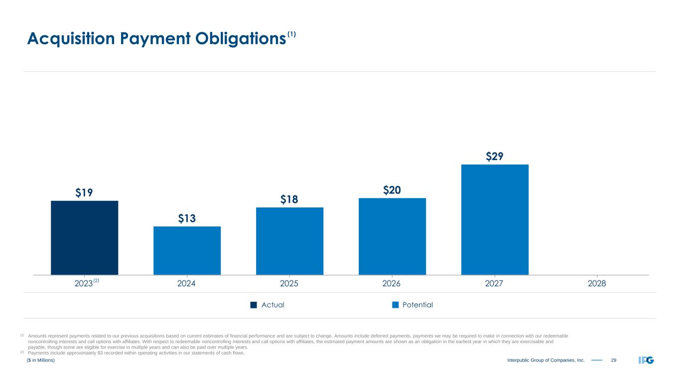 28Interpublic Group of Companies, Inc. (Amounts in Millions) Total Shares: Basic and Eligible for Dilution Dilutive SharesBasic Shares (1) Includes basic common shares outstanding, restricted shares, in-the-money stock options and convertible debt and preferred stock eligible for dilution. (2) Equals weighted-average shares outstanding as defined above for the twelve months ending December 31st for the periods presented. Weighted-Average (2) (1)
