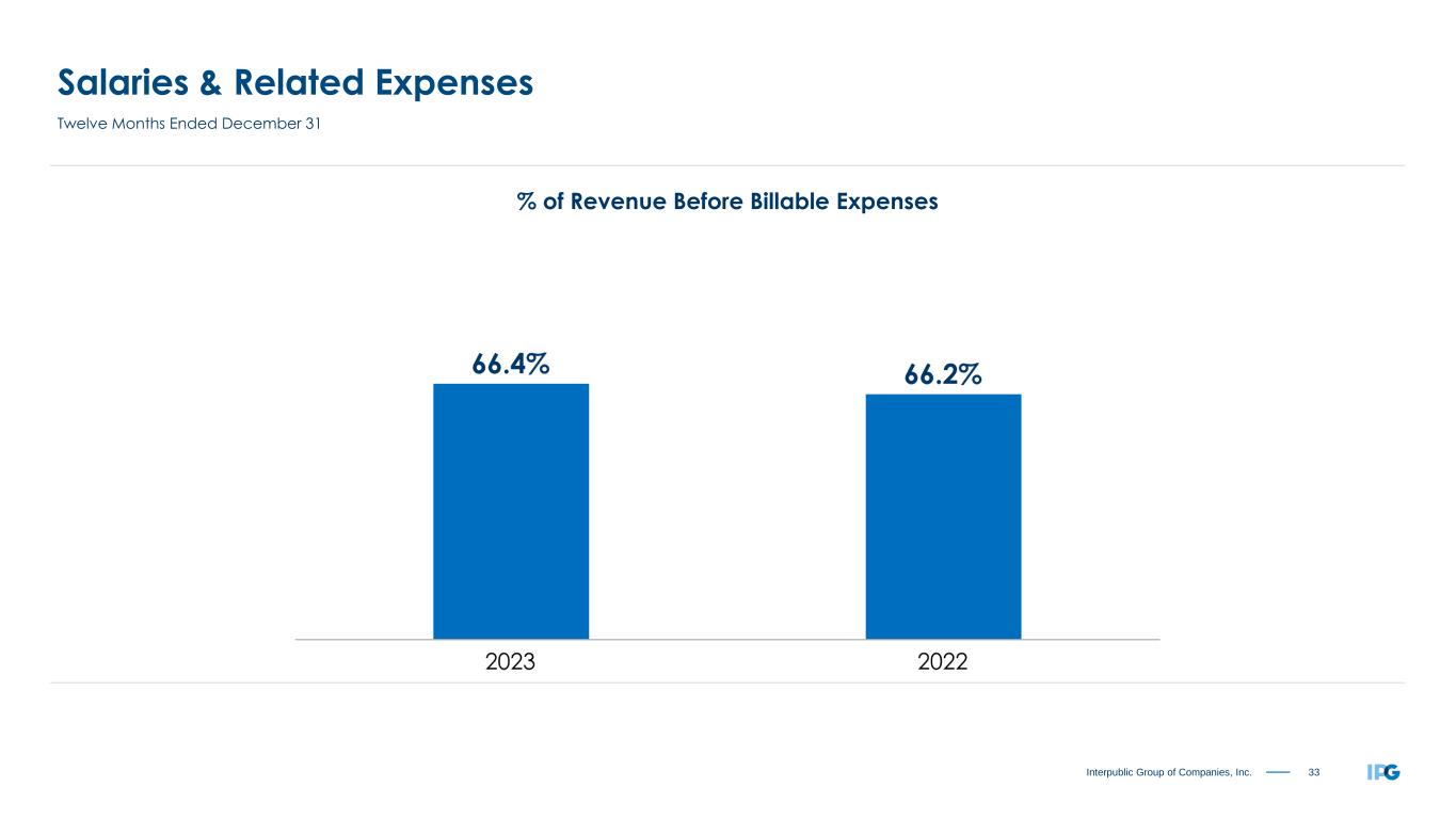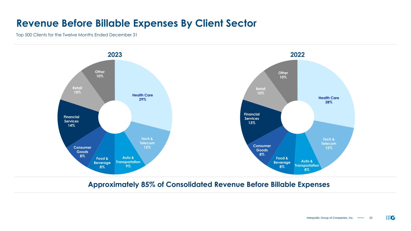 32Interpublic Group of Companies, Inc. Revenue Before Billable Expenses By Client Sector Top 500 Clients for the Twelve Months Ended December 31 Approximately 85% of Consolidated Revenue Before Billable Expenses (1) 2023 2022 Health Care 29% Tech & Telecom 12% Auto & Transportation 9% Food & Beverage 8% Consumer Goods 8% Financial Services 14% Retail 10% Other 10% Health Care 28% Tech & Telecom 15% Auto & Transportation 8% Food & Beverage 8% Consumer Goods 8% Financial Services 13% Retail 10% Other 10%