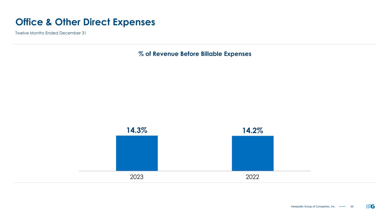 34Interpublic Group of Companies, Inc. Salaries & Related Expenses (% of Revenue Before Billable Expenses) “All Other Salaries & Related,” not shown, was 0.9% and 1.1% for the three months ended December 31, 2023 and 2022, respectively, and 1.0% and 1.1% for the twelve months ended December 31, 2023 and 2022, respectively. Three and Twelve Months Ended December 31 2023 2022